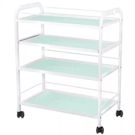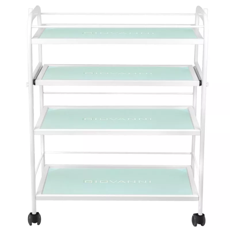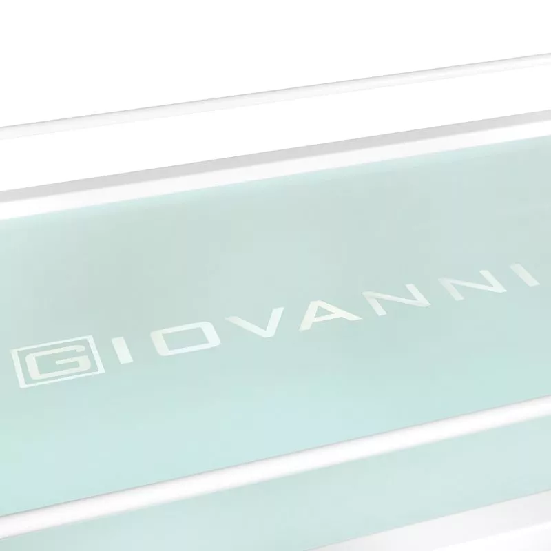 - Posiada cztery szklane półki z wygrawerowanym logo GIOVANNI, idealne do przechowywania urządzeń kosmetycznych.