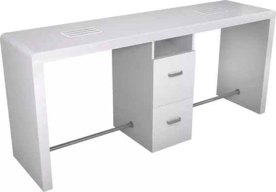 Nowoczesny dwuosobowy stolik do manicure wyposażony w podnóżki, dla większej wygody. Kolumna z dwoma szufladami na środku zapewnia wygodną przestrzeń na wszystkie akcesoria potrzebne do pracy. Wykonany z lakierowanego mdf’u.