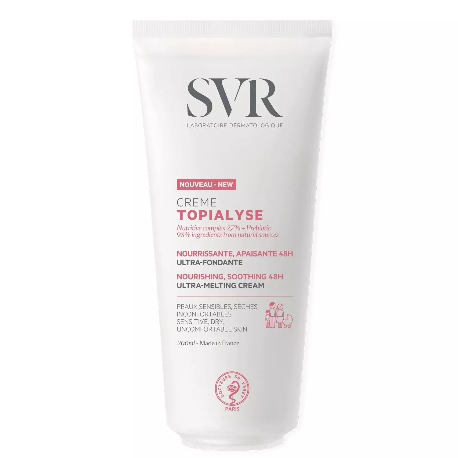 SVR Topialyse Creame to odżywczy krem do pielęgnacji skóry wrażliwej i suchej, idealny dla twarzy i ciała. Jego delikatna formuła jest odpowiednia nawet dla noworodków od pierwszego dnia życia, co czyni go wszechstronnym produktem dla całej rodziny.