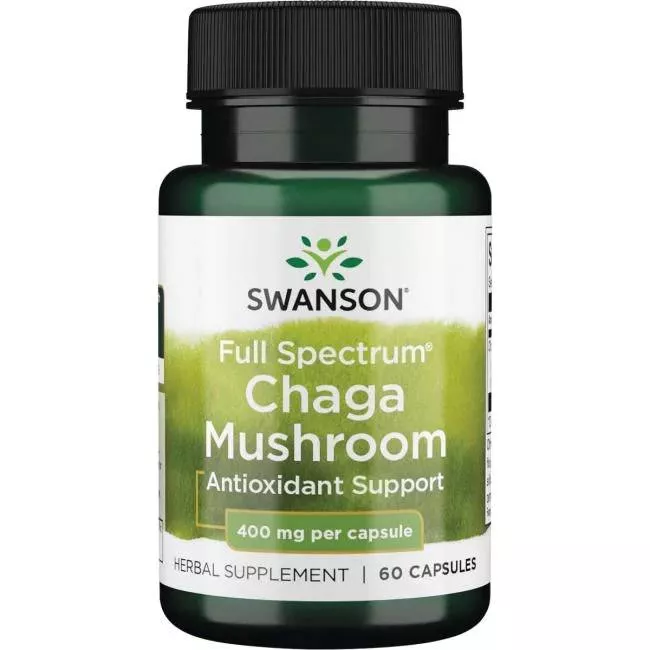 Swanson FS Chaga Mushroom to suplement diety zawierający ekstrakt z grzybów Chaga (Inonotus obliquus), znanych ze swoich właściwości zdrowotnych i wspomagających układ odpornościowy. Każde opakowanie zawiera 60 kapsułek, co stanowi wygodne, miesięczne zaopatrzenie dla osób dbających o zdrowie.