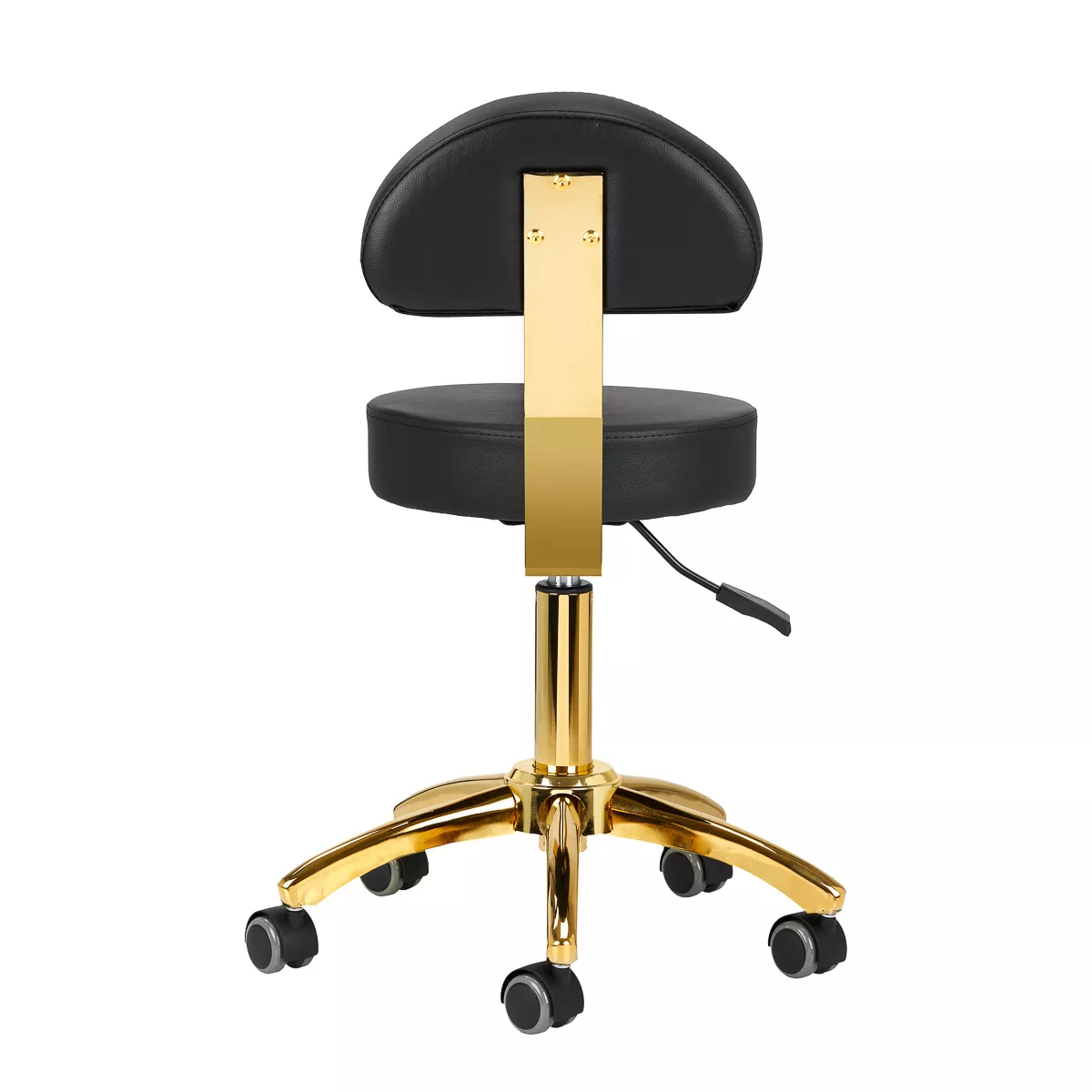 Pięcioramienna podstawa zapewnia stabilność oraz poczucie bezpieczeństwa, nawet podczas bardziej dynamicznych ruchów i częstych zmian pozycji. Wyposażenie w wytrzymałe koła zapewnia wysoką mobilność, co pozwala na swobodne przemieszczanie się po salonie czy gabinecie. Obicie ze skóry syntetycznej w odcieniach czerni, które jest nie tylko trwałe, ale także łatwe do utrzymania w czystości. Estetyczne obszycia i pikowanie nadają mu wyjątkowy wygląd, a złote elementy ozdobne dodają luksusowego charakteru, który przyciąga uwagę. Wyjątkowe połączenie elegancji oraz komfortu czyni taboret niezastąpionym narzędziem w pracy każdego profesjonalisty.