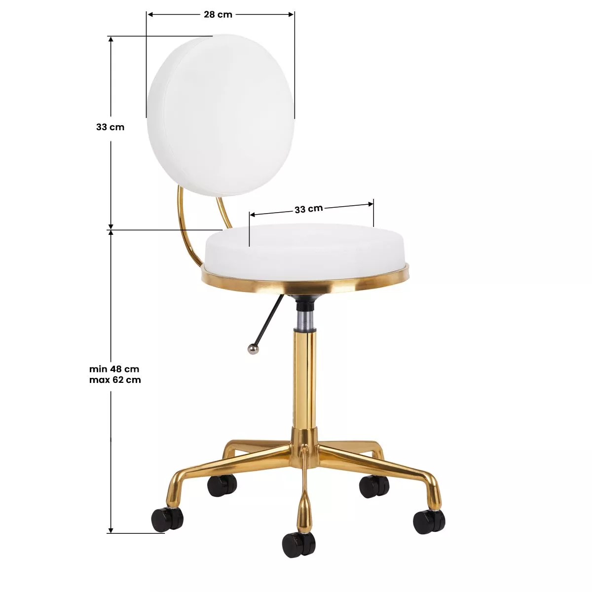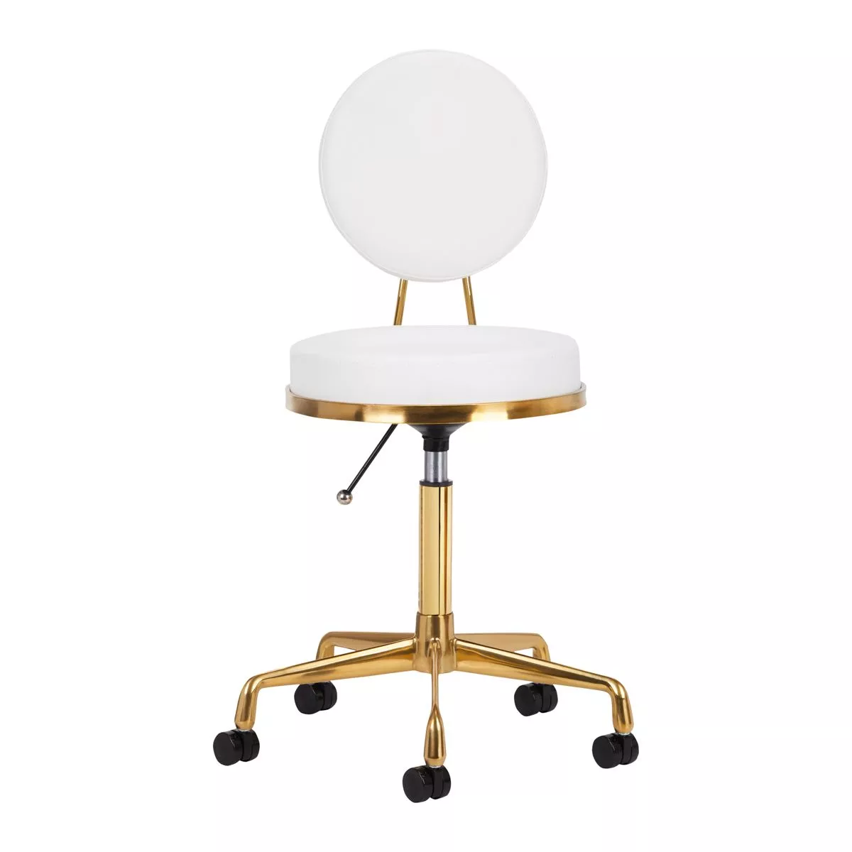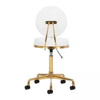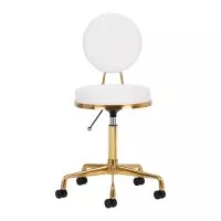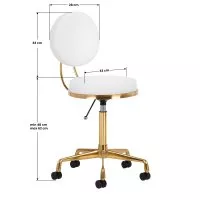 Ten złoto-biały taboret posiada wygodne siedzisko oraz oparcie pokryte skórą ekologiczną. Znajduje się na stabilnej pięcioramiennej podstawie. Skonstruowany z metalowych części jest trwały i odporny na zniszczenia. Wysokość siedziska jest sprawnie regulowana. Plastikowe kółka pozwalają na łatwą zmianę położenia. Siedzisko jest w pełni obrotowe.
