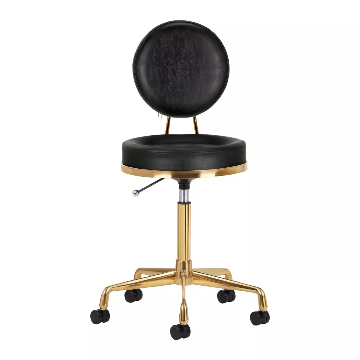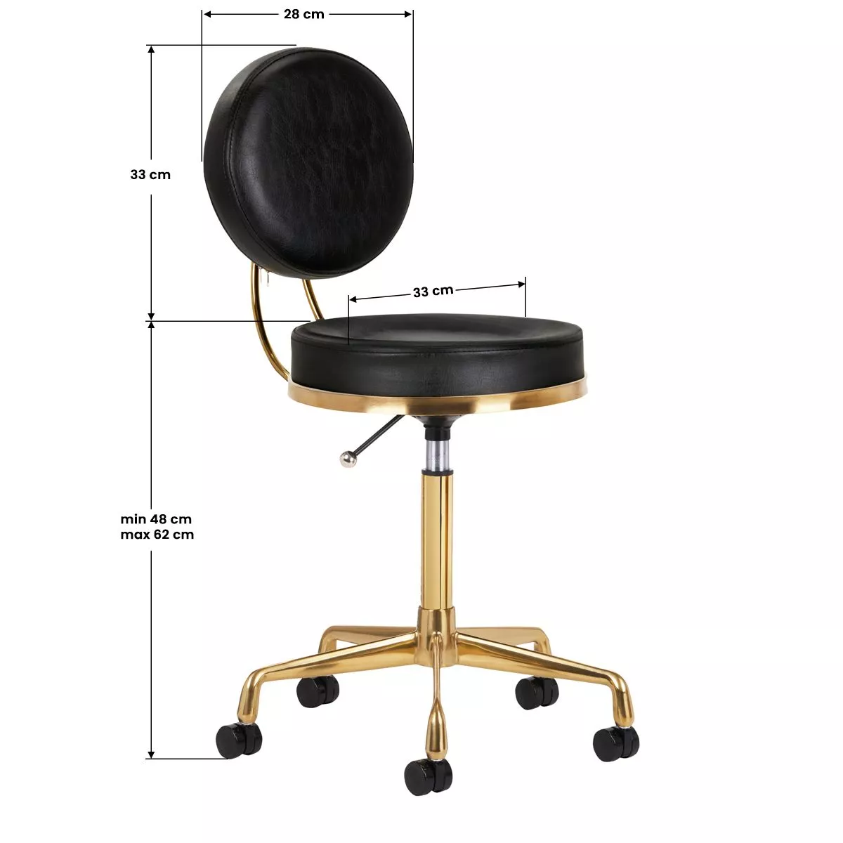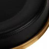 Ten czarno-złoty taboret posiada wygodne siedzisko oraz oparcie pokryte skórą ekologiczną. Znajduje się na stabilnej pięcioramiennej podstawie. Skonstruowany z metalowych części jest trwały i odporny na zniszczenia. Wysokość siedziska jest sprawnie regulowana. Plastikowe kółka pozwalają na łatwą zmianę położenia. Siedzisko jest w pełni obrotowe.
