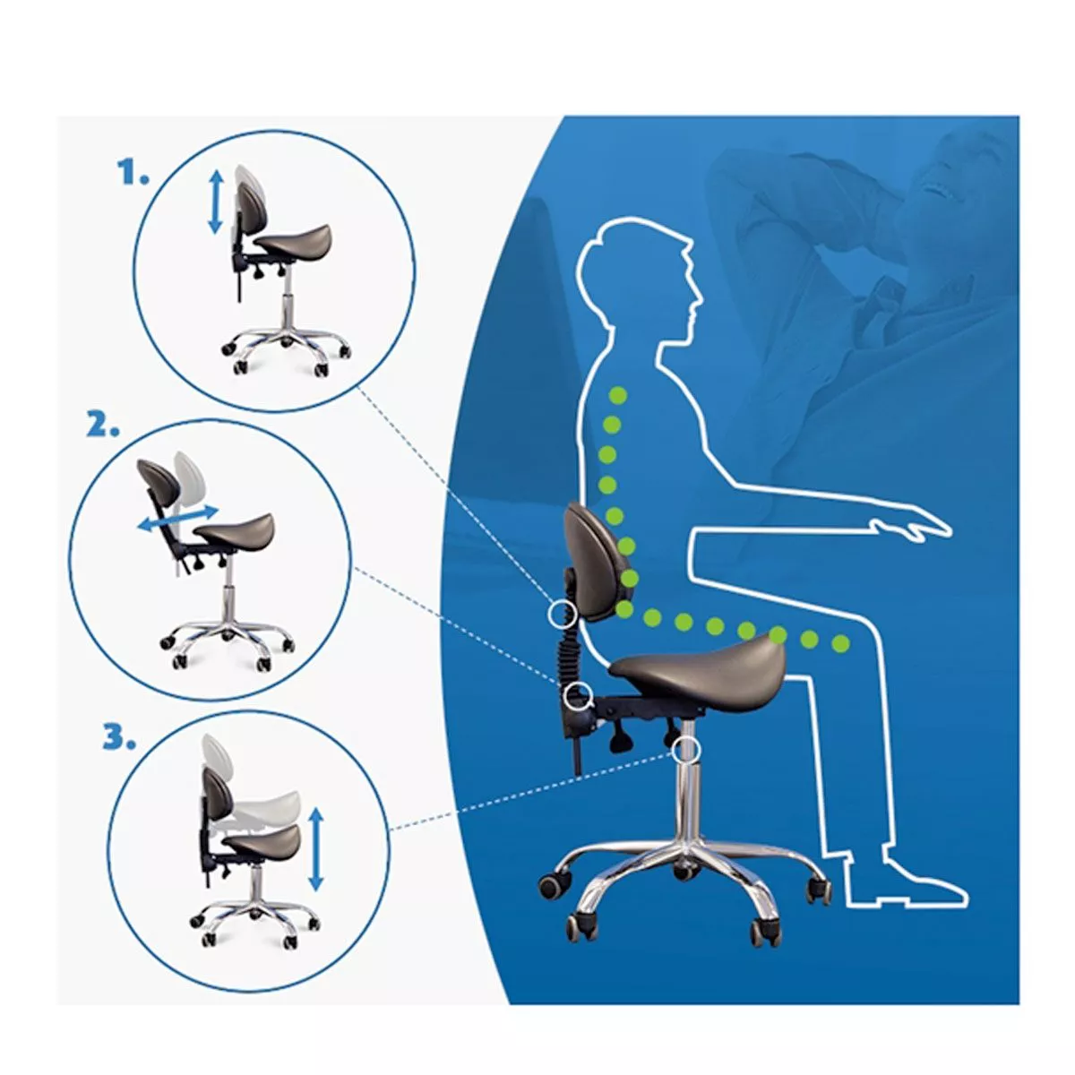 Pełna regulacja kąta nachylenia siedziska oraz wysokości oparcia.