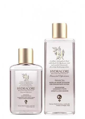 Luksusowy zestaw do regeneracji włosów Tecna Hydracore Panacea sprawia, że włosy są idealnie gładkie i dogłębnie nawilżone. Zabieg bazuje na kwasie hialuronowym, który doskonale nawilża włosy suche i cienkie, które potrzebują regeneracji. W składzie znajdziemy olej kendi i masło shea z organicznych upraw i wzmacniające aminokwasy, które zapewniają natychmiastowy i długotrwały efekt odnowy. Po zmieszaniu obu produktów przyjmują one żelową formułę, którą łatwo nakłada się na włosy.