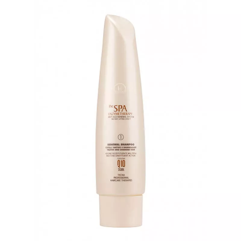 Szampon oczyszczający Tecna SPA Renewal Shampoo to idealne rozwiązanie dla włosów zniszczonych i uszkodzonych. Szampon delikatnie zmywa silikony i pozostałości olejowe zarówno z włosów, jak i skóry głowy. Zawiera aminokwasy i ekstrakty roślinnne. To pierwszy element Rytuału SPA Q10, który zmierza do odmłodzenia i poprawy kondycji pasm.