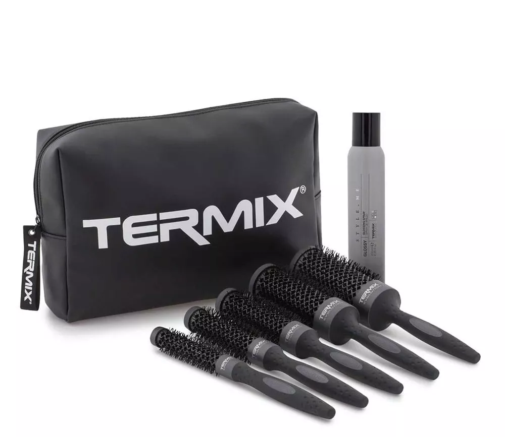 Termix Evo Plus, zestaw 5 szczotek czarnych okrągłych + spray Glossy, różne rozmiary