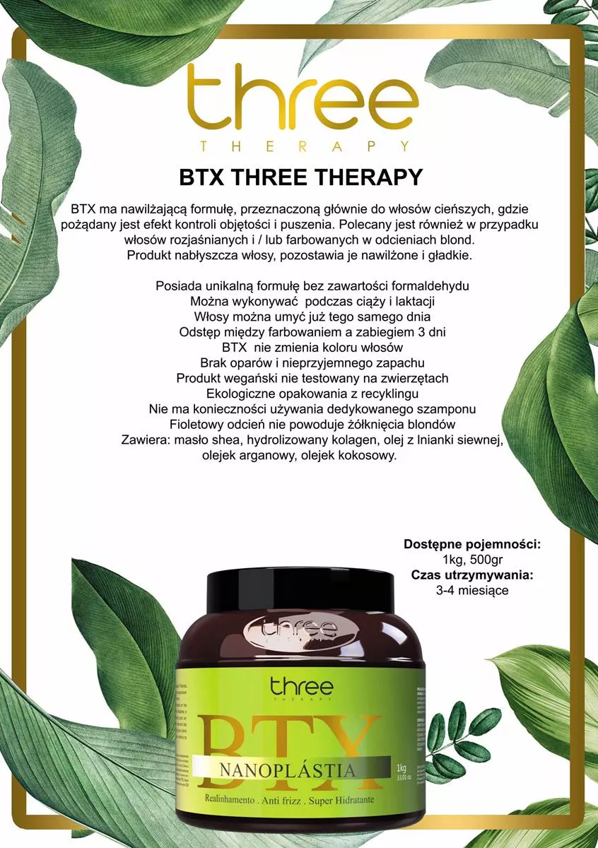 Kuracja Three Therapy Nanoplastia Botox BTX ma nawilżającą formułę, przeznaczoną głównie do włosów cieńszych. Preparat pozwala kontrolować puszenie i objętość włosów. Polecany jest również w przypadku włosów rozjaśnianych i / lub farbowanych w odcieniach blond. Po zabiegu włosy są gładkie, nawilżone, błyszczące. Formuła bez formaldehydu jest bezpieczna dla włosów i skórą głowy.