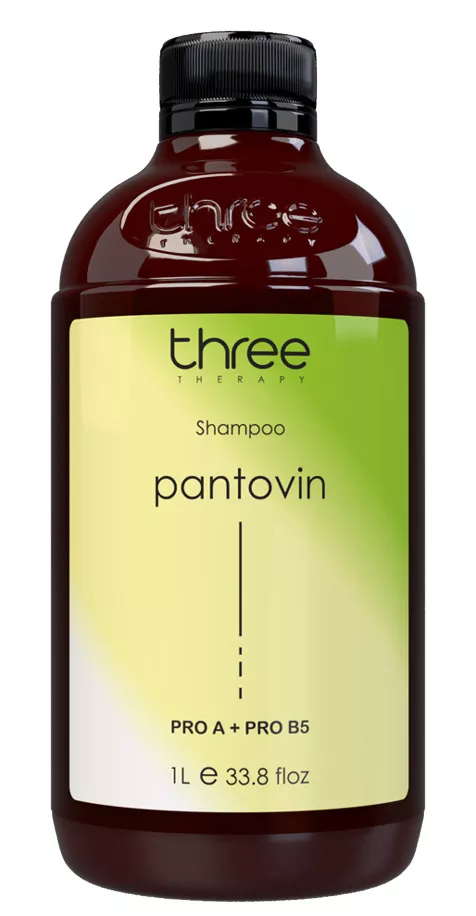 Szampon do włosów Three Therapy Pantovin oczyszcza włosy i skórę głowy, odblokowuje cebulki, wzmacnia i wspiera wzrost włosów. Ma działanie rozszerzające naczynia krwionośne. może być stosowany do każdego rodzaju włosów, szczególnie polecany do włosów, które tracą gęstość. Dzięki pobudzeniu krążenia krwi obwodowej, szampon poprawia wchłanianie składników odżywczych, co przyczynia się do lepszego wzrostu mieszków włosowych. Efekty widoczne już w pierwszych tygodniach stosowania. W składzie: masło shea, olejek kokosowy, gardenia tahitańska, olej z orzechów makadamia, hydrolizowana keratyna.