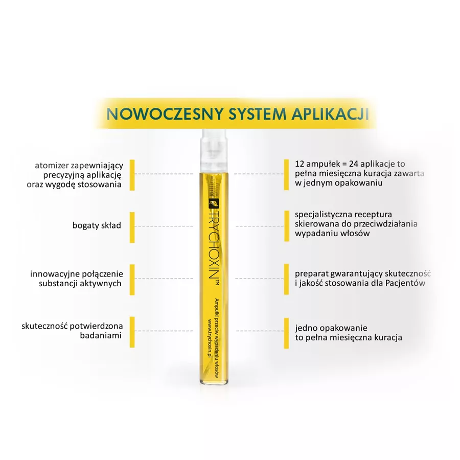 Poznaj niesamowitą kurację przeciw wypadaniu włosów Trychoxin! Kosmetyk ten przezaczony jest dla włosów słabych i wypadających. W skuteczny sposób ogranicza wzmożoną utratę włosów oraz wspomaga odrost włosów. W efekcie słosy stają się silniejsze, piękniejsze i grubsze. Skuteczność produktu opiera się na trójfazowej zasadzie działania.
