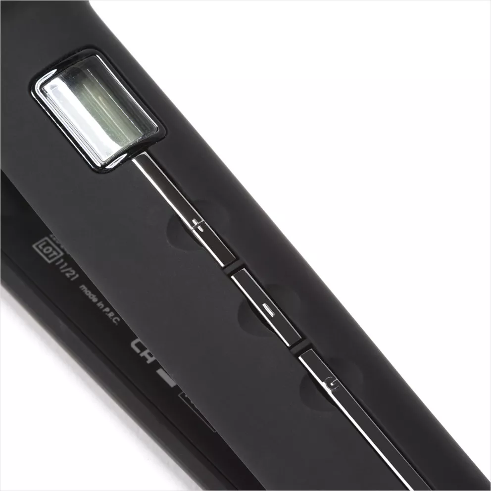 - Tytanowe płytki ceramiczne z powłoką turmalinową – zapewniają równomierne nagrzewanie, chronią włosy przed przegrzaniem i nadają im zdrowy połysk.
