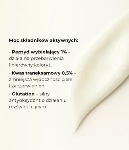 - Unikalne połączenie składników aktywnych: peptyd wybielający 1%, kwas traneksamowy 0,5% i glutation.