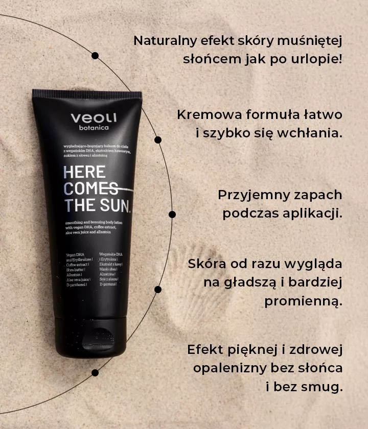 Veoli Botanica Here Comes The Sun to idealna propozycja dla osób, które pragną uzyskać naturalny efekt opalenizny przy jednoczesnej pielęgnacji skóry. Postaw na zdrowy wygląd i komfort każdego dnia – wybierz balsam brązujący z wegańskim DHA i przekonaj się, jak łatwo możesz cieszyć się promienną, gładką skórą przez cały rok!