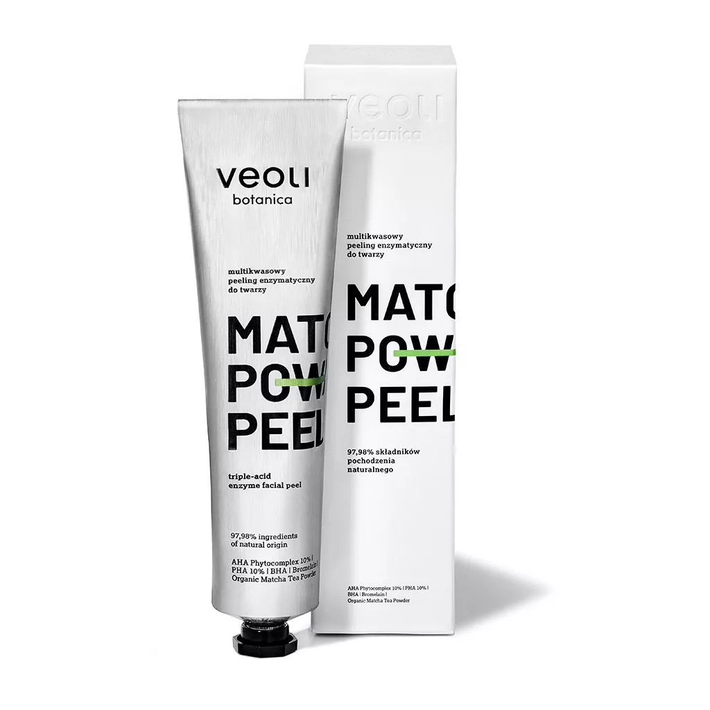 Veoli Botanica Matcha Power Peel to innowacyjny multikwasowy peeling enzymatyczny do twarzy, który zawiera aż 97,98% składników pochodzenia naturalnego. Dzięki zaawansowanej formule z aktywnym kompleksem AHA Phytocomplex 10%, PHA 10%, BHA oraz sproszkowaną, organiczną zieloną herbatą matcha, produkt działa w formie ekspresowej maski, zapewniając skórze natychmiastowe złuszczenie, wygładzenie i rewitalizację.