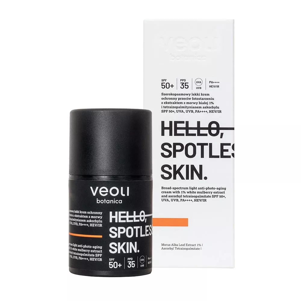 Odkryj nową jakość codziennej pielęgnacji z Veoli Botanica Hello, Spotless skin – szerokopasmowym, lekkim kremem ochronnym przeciw fotostarzeniu, który nie tylko skutecznie zabezpiecza Twoją skórę przed szkodliwym promieniowaniem UVB, UVA, HEV i IR, ale także aktywnie wspiera walkę z przebarwieniami i wyrównuje koloryt cery. To idealny wybór dla osób poszukujących kompleksowej ochrony przeciwsłonecznej połączonej z zaawansowaną pielęgnacją rozjaśniającą przez cały rok.