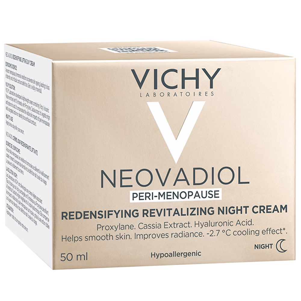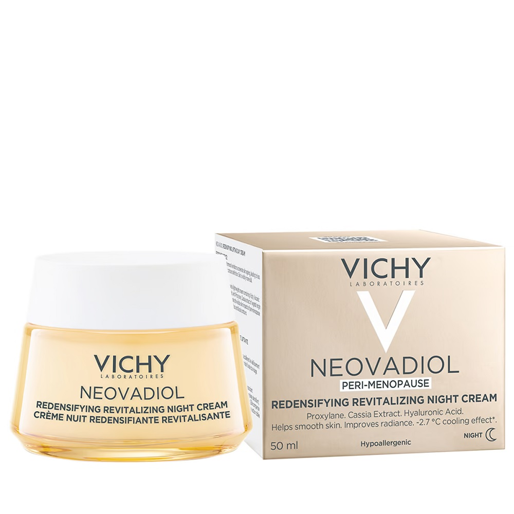 Vichy Neovadiol Peri-Menopause to ujędrniający krem na noc, który przywraca gęstość skóry, wygładza ją, poprawia jej blask i zapewnia efekt chłodzenia. W okresie menopauzy zmiany hormonalne, takie jak wzrost kortyzolu i spadek estrogenu, przyspieszają proces starzenia, prowadząc do utraty gęstości i elastyczności skóry. Ten krem na noc reaktywuje mechanizmy skórne w okresie menopauzy, poprawiając jędrność i gęstość skóry.