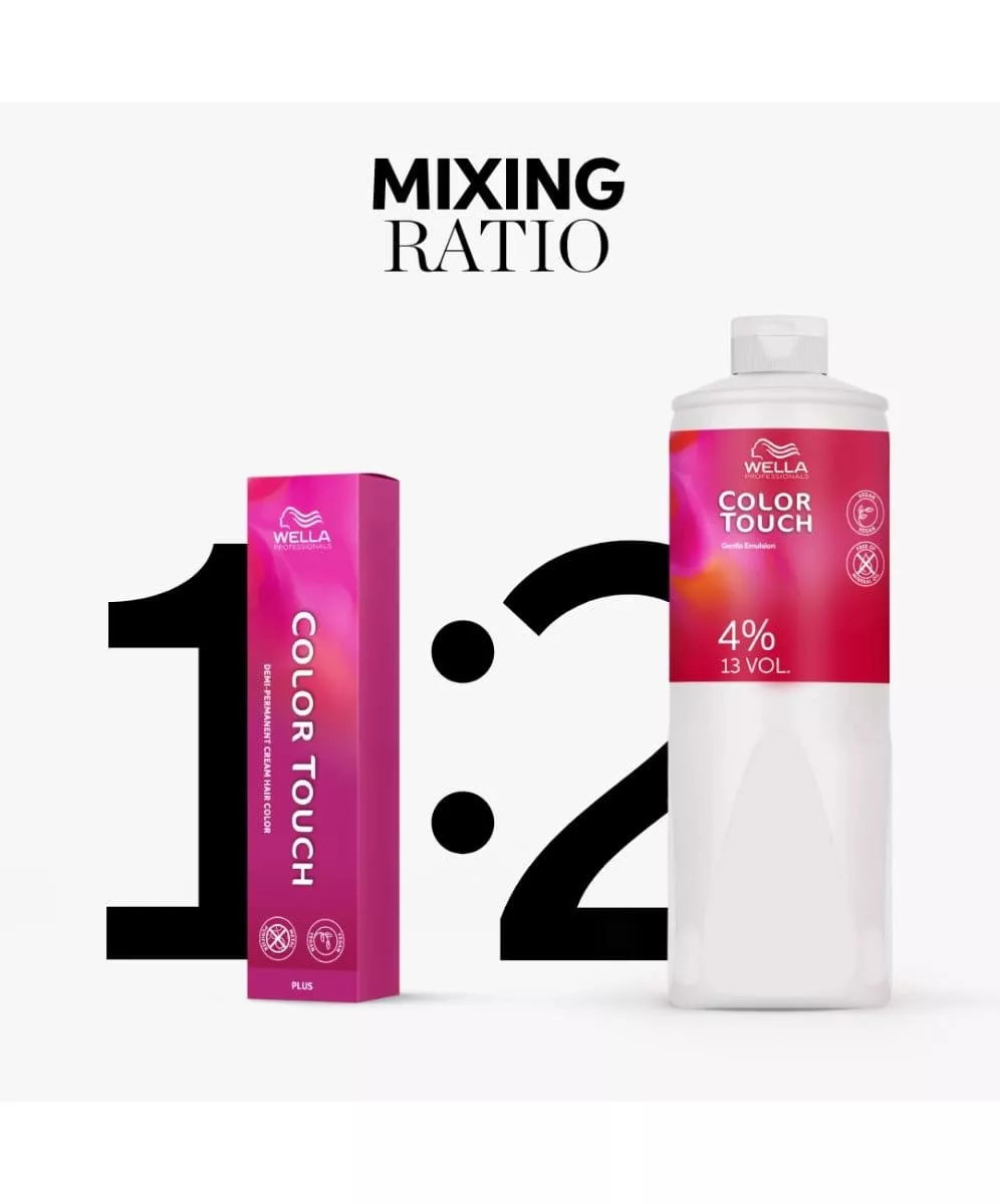 W niemetalowej miseczce wymieszaj emulsję z dedykowanym kremem koloryzującym z linii Color Touch w proporcji 1:2 (np. 30 ml farby i 60 ml emulsji).
