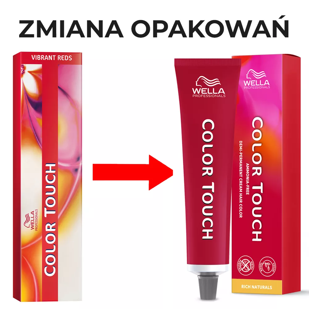 Wella Color Touch - półtrwała farba bez amoniaku, krem tonujący (60 ml). Do farby należy dokupić oksydant. Krem dzięki łagodnej i zarazem skutecznej formule wyrównuje porowatą strukturę włosów i zapewnia skuteczną przyczepność pigmentów odbijających światło, odpowiedzialnych za głębokość i wielowymiarowość refleksów oraz nadanie połysku. Rezultatem jest do 50% bardziej żywy kolor. Krem koloryzujący bez amoniaku zawiera naturalny wosk, który nadaje włosom piękny blask i wydobywa intensywny, żywy kolor oraz połysk intensywniejszy o 50% w porównaniu do naturalnych włosów.