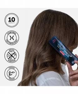 Color Xpress ME+ to innowacyjna, trwała farba do włosów, która pozwala oferować ekspresowe usługi odświeżenia odrostów z nawet 100% pokryciem siwych włosów w zaledwie 10 minut. Uzyskaj szybkie i niezawodne rezultaty dzięki przełomowej technologii ControlX, która działa jak magnes, ściągając barwniki i przyspieszając proces koloryzacji. Następnie zapobiega nadmiernemu przetwarzaniu koloru, zapewniając trwałe i niezawodne efekty. Formuła jest odpowiednia do aplikacji pędzlem. Produkt jest wegański, a jego tubka wykonana w 100% z recyklingu i zapakowana w w pełni nadające się do recyklingu pudełko kartonowe.