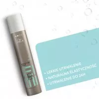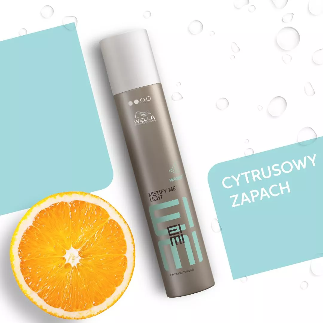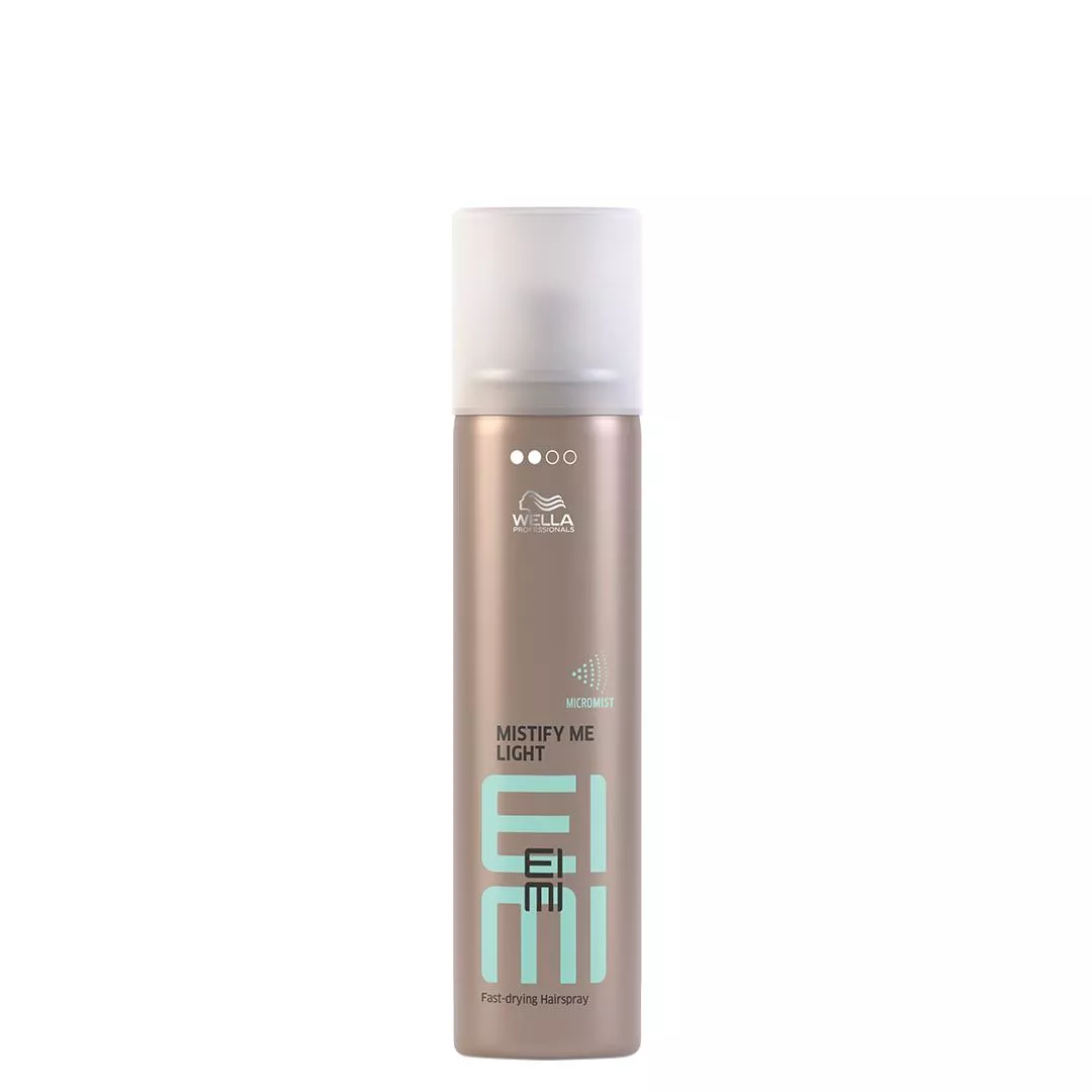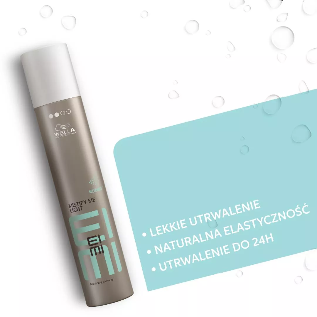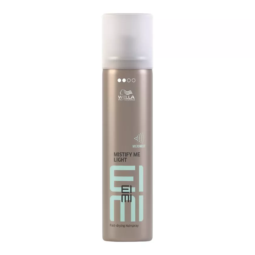 Dzięki profesjonalnym produktom z serii Eimi Wellla Professionals stylizacja włosów może być prostsza niż kiedykolwiek. Lekko utrwalający lakier Eimi Mistify Me Light zapewnia naturalną elastyczność i utrwalenie fryzury nawet do 24 godzin. Profesjonalny lakier zachwyca swoimi właściwościami – przede wszystkim bardzo szybko wysycha, umożliwiając precyzyjne układanie i to bez zbędnego obciążenia pasm. Eimi Mistify Me Light to również doskonała ochrona przed wilgocią – włosy nie skręcają się i nie puszą, zachowując odpowiednie ułożenie. Lakier wzbogacono o specjalną technologię Micromist, pozwalającą na rozpylanie bardzo drobnych cząsteczek, które pomagają ujarzmić niesforne i elektryzujące się włosy, dzięki czemu możesz się cieszyć wymarzoną fryzurą przez wiele godzin.