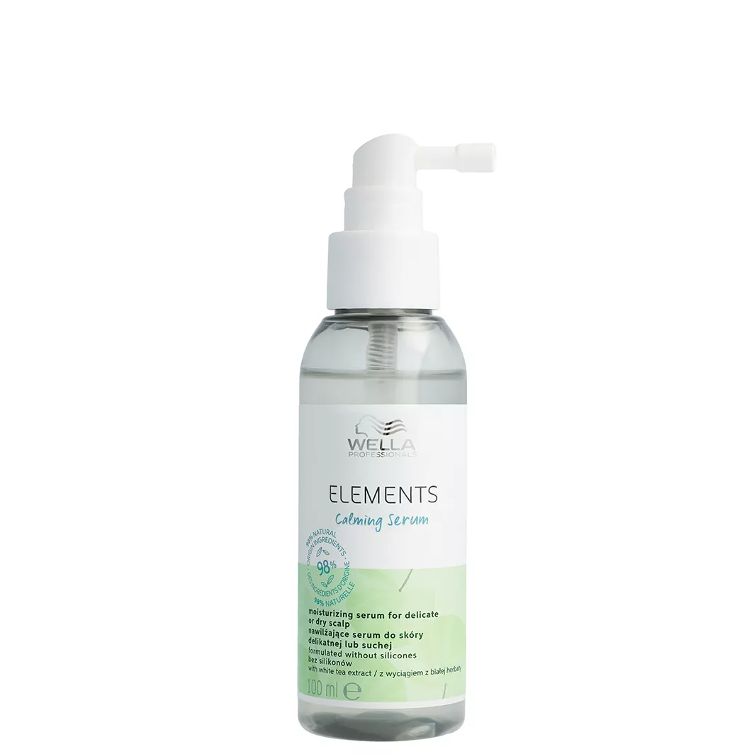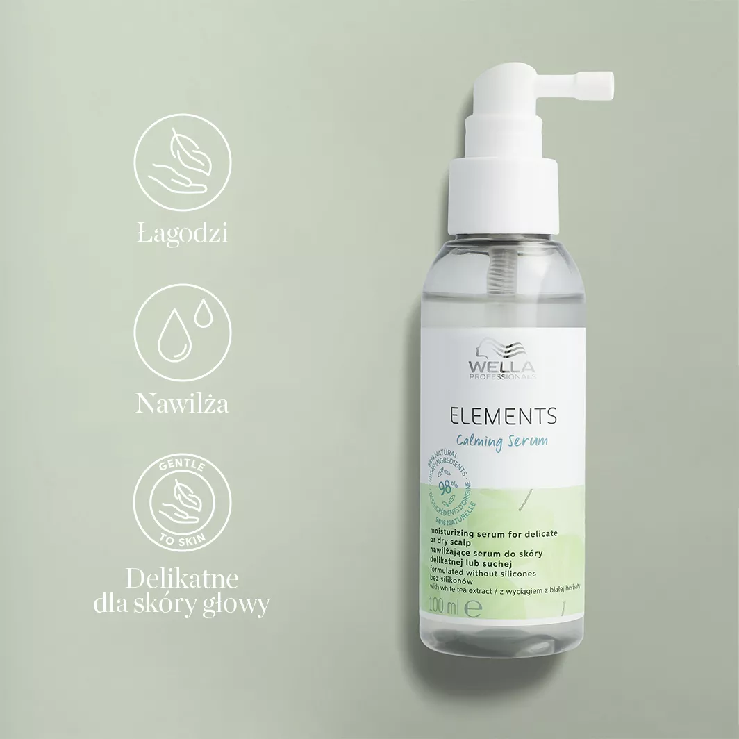 Serum do wrażliwej skóry głowy Wella Elements Calming łagodzi podrażnienia, nawilża i przynosi ukojenie delikatnej oraz suchej skórze. Kosmetyk nie zmniejsza objętości włosów i nie powoduje ich przyklapnięcia. W składzie znajduje się roślinna gliceryna. Serum zawiera 98% składników pochodzenia naturalnego. Serum Calming przywraca komfort suchej oraz podrażnionej skórze głowy, przywraca ponadto optymalne nawilżenie.