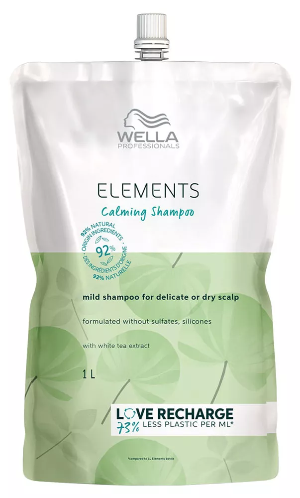 Szampon do wrażliwej i suchej skóry glowy Wella Elements Calming przywraca komfort i dobre samopoczucie. Szampon delikatnie oczyszcza skórę dzięki zawartości surfaktantów pochodzenia naturalnego. Ponadto działa nawilżająco, kojąco i uspokajająco. Włosy wyglądają zdrowo, są odświeżone i błyszczące. W składzie nie ma siarczanów, silikonów. Aż 92% naturalnych składników.