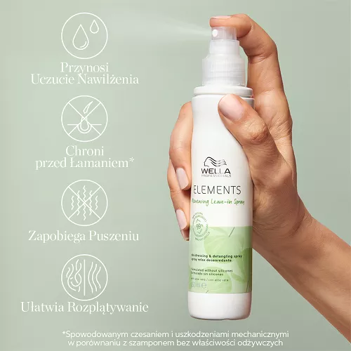Lotion do włosów bez spłukiwania Wella Elements Renewing wygładza kosmyki, ułatwia ich rozczesywanie i chroni przed uszkodzeniami mechanicznymi, widocznie zmniejszając łamliwość włosów. Włosy staja się bardziej gładkie, miękkie i łatwe do układania. Lotion ma wygodną formułę sprayu bez spłukiwania. Kosmetyk zawiera 99% składników pochodzenia naturalnego. Opakowanie w 80% z plastiku recyclingowanego.