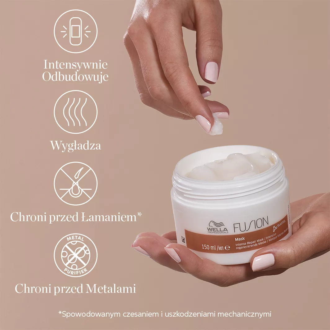 Odbudowująca maska Wella Professionals Fusion została opracowana, aby odżywiać zniszczone włosy, uszkodzone także przez różne czynniki zewnętrzne. Wspiera intensywną regenerację i wzmocnienie włosów, zwiększa ich odporność na zniszczenia wywołane przez zabiegi, takie jak dekoloryzacja, trwała ondulacja lub przez urządzenia termiczne, jak falownica, prostownica, czy suszarka.