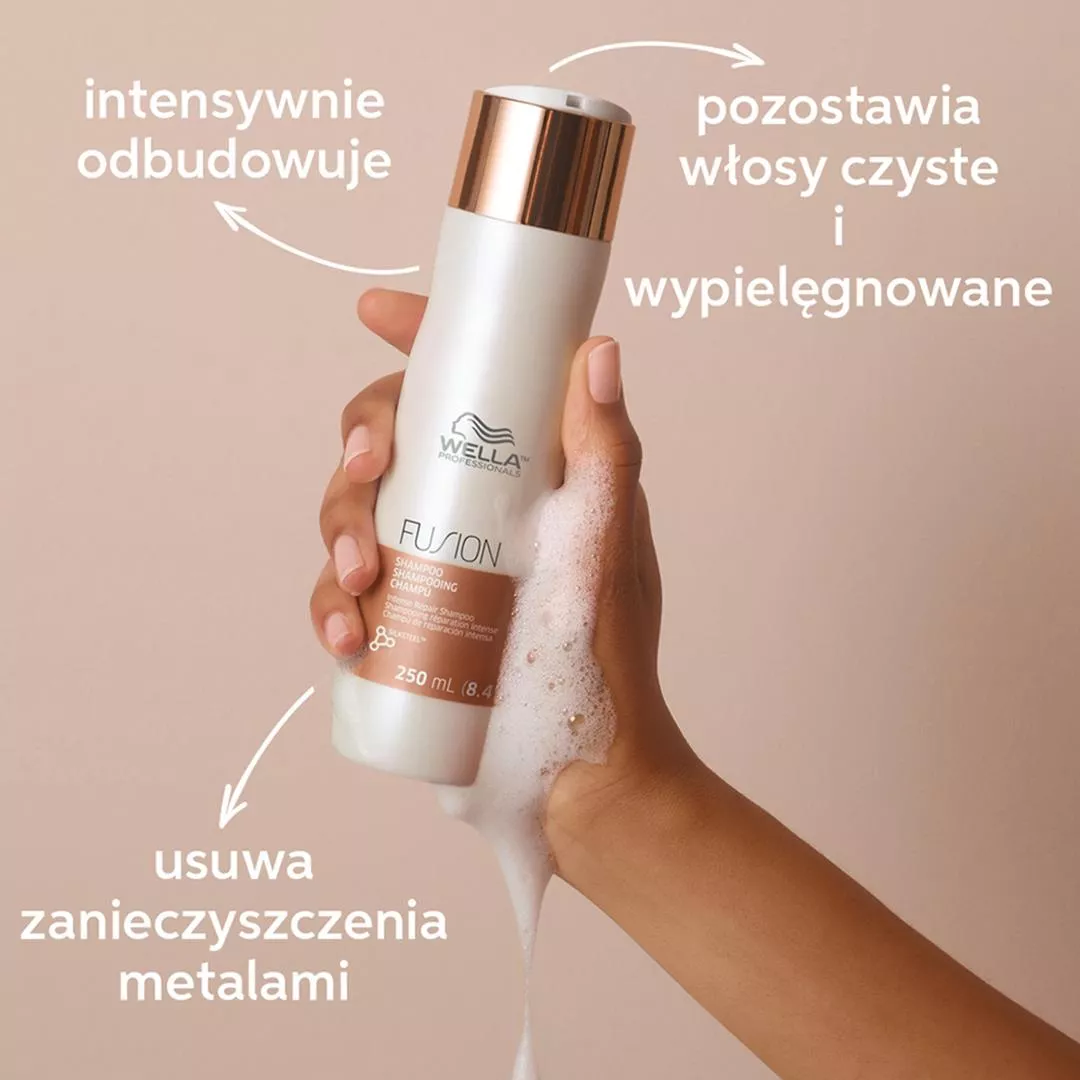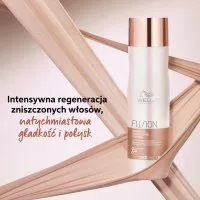 Chcesz poprawić ogólną kondycję swojej fryzury? Szukasz kosmetyku wspierającego wzmocnienie włosów? Profesjonalny, intensywnie regenerujący szampon do włosów rozjaśnianych i zniszczonych częstymi zabiegami chemicznymi Wella Professionals Fusion działa na poziomie makro oraz mikro. Innowacyjna technologia naprawcza dogłębnie regeneruje, myje i pielęgnuje. Dzięki zastosowaniu unikalnej formuły opartej na aminokwasach jedwabiu składniki szamponu wnikają w głąb kory, sprawiając, że nawet suche i zniszczone włosy znowu stają się miękkie, znacznie bardziej elastyczne i odporne na ponowne uszkodzenia.