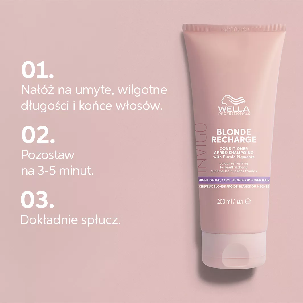 Chcesz utrzymać odcień zimnego blondu na dłużej? Odżywka Wella Professionals Invigo Blond-Recharge to produkt pielęgnacyjny wzbogacony pigmentami koloru. Doskonale odświeża kolor włosów blond i siwych. Produkt ma w składzie fioletowy pigment i pozwala na uzyskanie efektu w tonacji zimnego odcieniu blondu. Produkty z lini Blonde-Recharge dedykowane są do pielęgnacji włosów blond i siwych i ich koloru.
