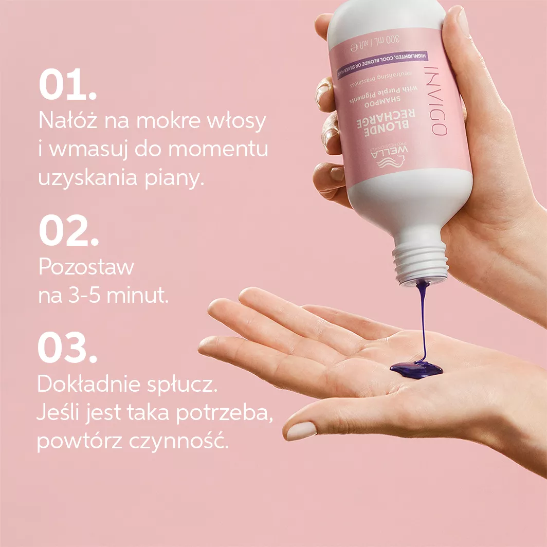 Używam szamponu Wella INVIGO Blonde Recharge, aby utrzymać chłodny odcień mojego blond. Szampon skutecznie neutralizuje żółte tony i sprawia, że włosy wyglądają na zdrowsze oraz są bardziej lśniące. Jest świetny pomiędzy wizytami u fryzjera, bo odświeża kolor bez konieczności częstego farbowania.