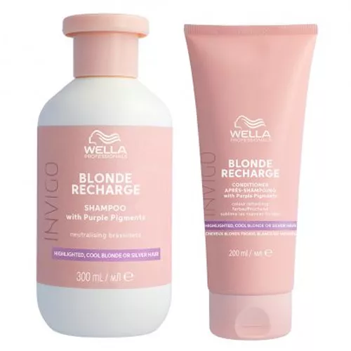 Szampon Wella Professionals Invigo Blond-Recharge to produkt pielęgnacyjny wzbogacony fioletowymi pigmentami koloru. Doskonale myje włosy i jednocześnie odświeża kolor włosów blond i siwych. Produkt zawiera fioletowy pigment, co pozwala na uzyskanie tonacji zimnego odcienia blondu. Produkty z lini Blonde-Recharge dedykowane są do pielęgnacji włosów blond i siwych i ich koloru.Chcesz utrzymać odcień zimnego blondu na dłużej? Odżywka Wella Professionals Invigo Blond-Recharge to produkt pielęgnacyjny wzbogacony pigmentami koloru. Doskonale odświeża kolor włosów blond i siwych.