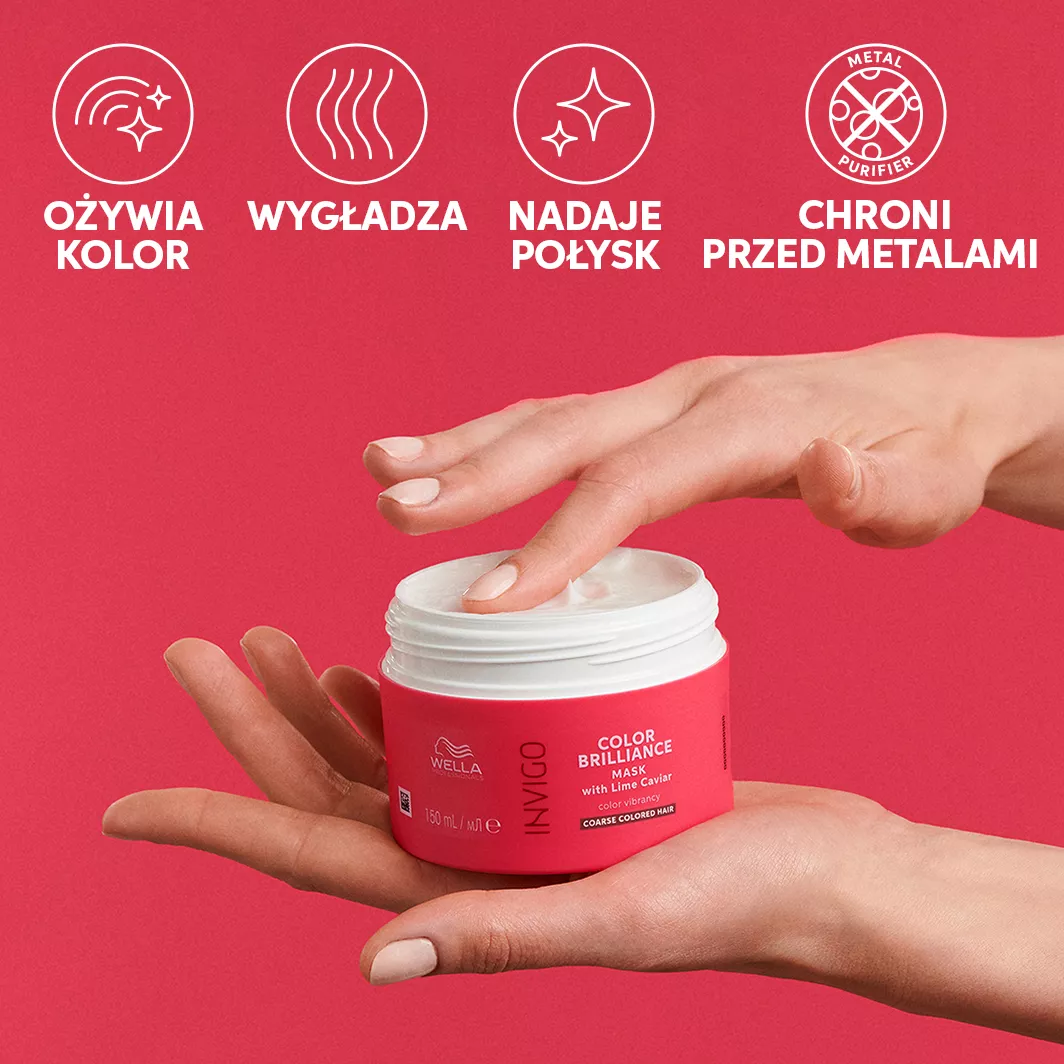 Maska Wella Professionals posiada innowacyjną technologię Anti-Oxidant Shield, która zawiera molekuły chroniące cząsteczki miedzi przed wejściem w reakcję z tlenem, zapobiegając matowieniu włosów. Produkt wzbogacono także o kawior limonkowy, zawierający antyoksydanty i witaminy, dzięki czemu pomaga nawilżyć i odżywić każde pasmo włosów. Maska Invigo Color Brilliance odżywi włosy dogłębnie, a dzięki zoptymalizowanemu pH jest dodatkowo bezpieczna dla skóry głowy.