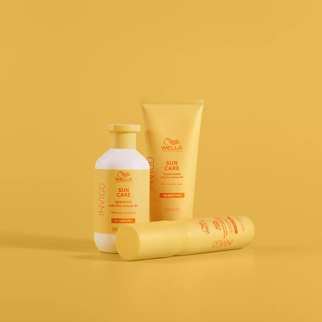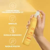 Podczas ekspozycji na słońce pielęgnuj włosy za pomocą sprayu chroniącego kolor włosów Wella Professionals Invigo Sun UV, lakieru do włosów bez spłukiwania, który zapewnia skuteczną ochronę przed promieniowaniem UV. Spray pozostawia włosy nawilżone i przyjemnie miękkie w dotyku. Wzbogacony prowitaminą B5, która chroni kolor włosów przed uszkodzeniami słonecznymi i dodaje blasku.