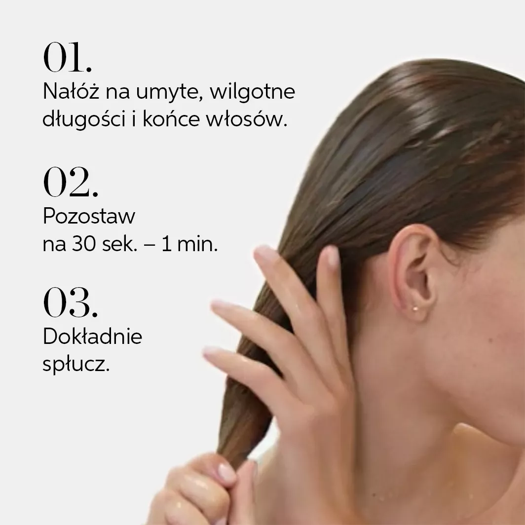 Nałóż odżywkę na wilgotne, wcześniej umyte włosy. Pozostaw na minutę, potem dokładnie spłucz. Możesz stosować po każdym myciu.