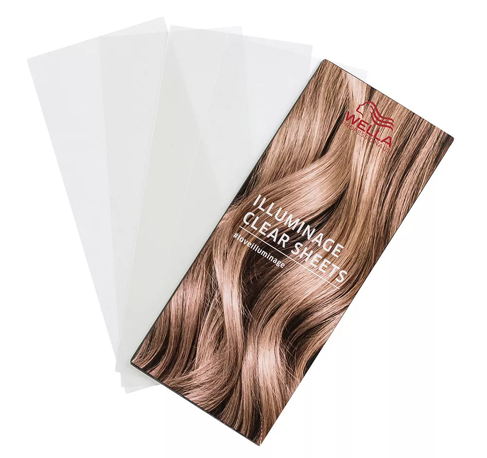 Foliowe paski do koloryzacji Wella Illuminage, wielokrotnego użytku. Paski są przezroczyste, co pozwala kontrolować proces farbowania włosów bez konieczności odchylania folii. W opakowaniu 100 sztuk pasków.
