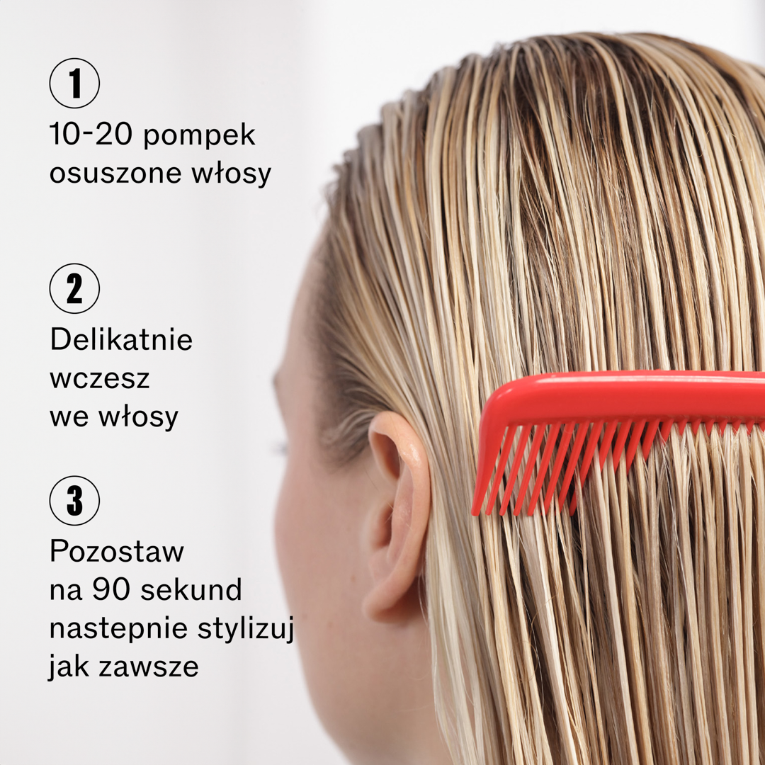 W zależności od długości pasm spryskać 5-15 pompek serum, stosując na umyte, wilgotne włosy, a następie dokładnie rozczesać. Nie spłukiwać. Po upływie 90 sekund można nakładać kolejne kosmetyki i stylizować włosy.