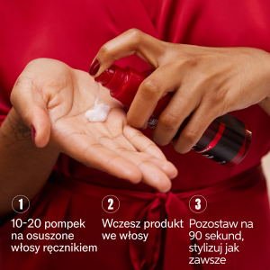 W zależności od długości pasm spryskać 5-15 pompek serum, stosując na umyte, wilgotne włosy, a następie dokładnie rozczesać. Nie spłukiwać. Po upływie 90 sekund można nakładać kolejne kosmetyki i stylizować włosy.