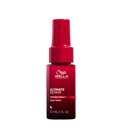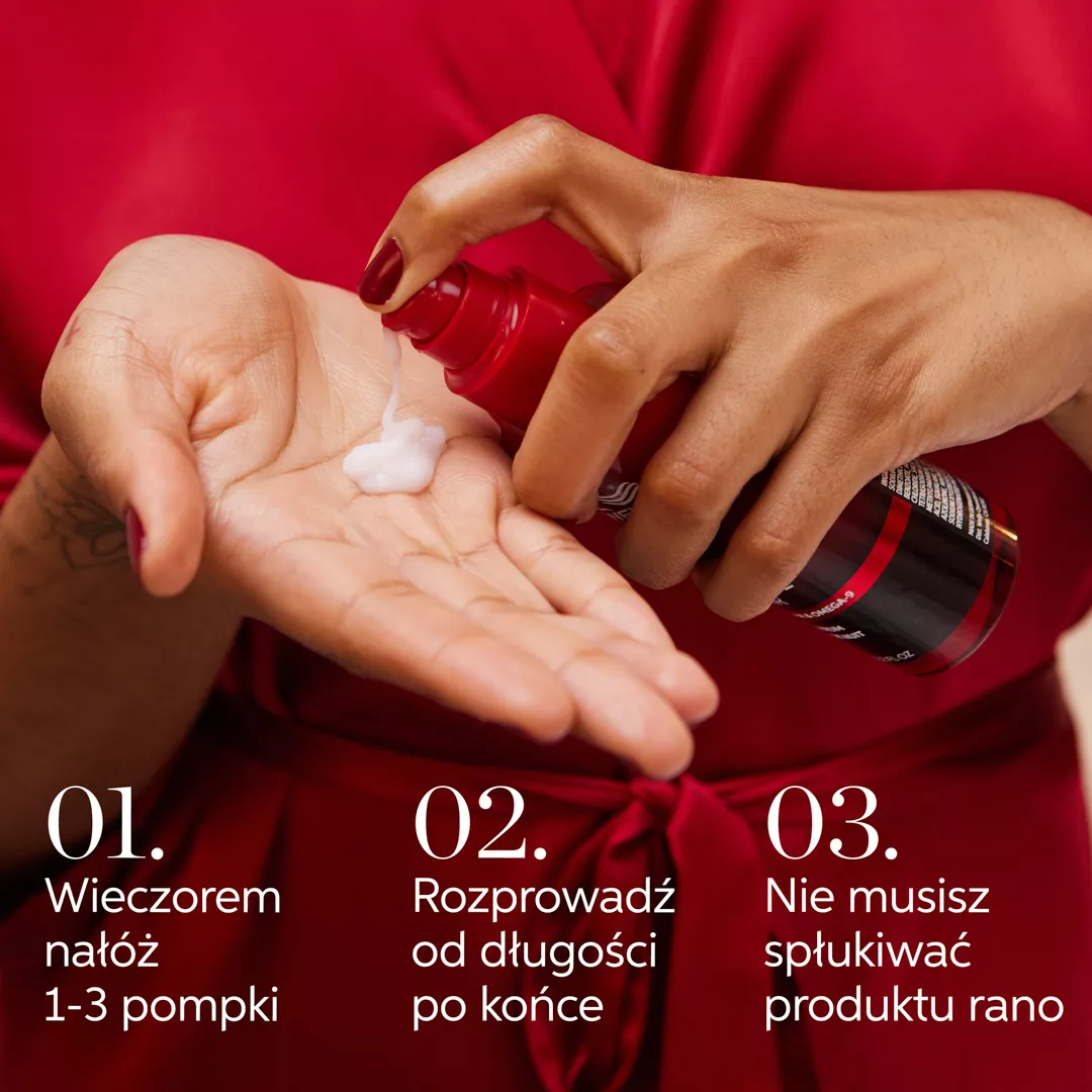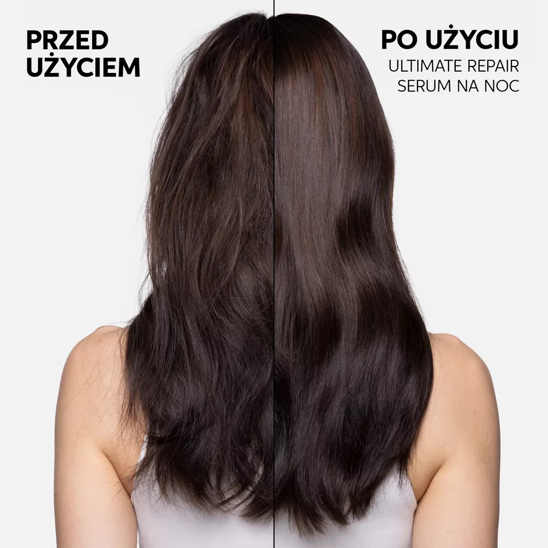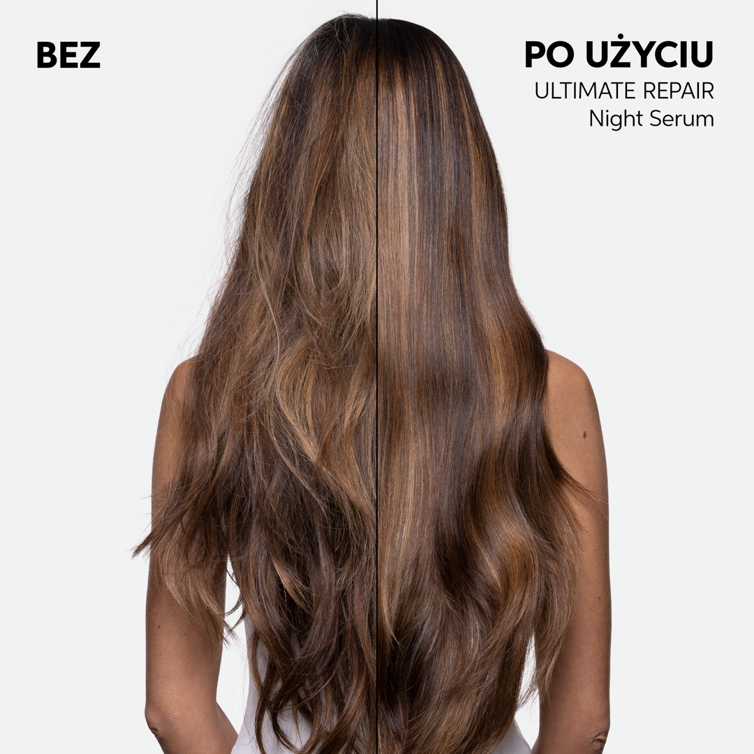 1/3 swojego życia spędzasz na spaniu. Wyobraź sobie, że możesz wykorzystać ten czas, aby naprawić swoje włosy. Serum na noc Wella Professionals Ultimate Repair pozwala Ci to zrobić, dzięki czemu możesz obudzić się z włosami gotowymi na poranek, które wyglądają na odżywione, dzięki potrójnej mocy lekkiej formuły zapewniającej naprawę, nawilżenie i ochronę suchych, zniszczonych włosów. Ta niewymagająca spłukiwania, bezpieczna dla poduszki formuła idealnie działa na Twoje włosy. Serum na noc pomaga zapewnić Twoim włosom najlepszą opiekę, nawet gdy śpisz. Żaden wieczorny rytuał pielęgnacyjny nie powinien być pozbawiony tej formuły. Serum na noc zawiera kwas Omega-9, który wnika głęboko we włosy, nawilżając je, oraz polimery ochronne, które tworzą niewidzialną tarczę. Wszystko to przyczynia się do naprawy zniszczonych włosów w nocy i ich odżywienia przez nawet 8 godzin. Efekty widoczne są już od pierwszej nocy, z kontrolą puszenia się, nawet 6-krotnie gładszymi włosami* oraz wyglądającymi na odżywione, promienne i mniej zmęczone. Po tygodniu możesz doświadczyć do 78% mniej łamliwości* oraz do 86% mniej rozdwojonych końcówek*.