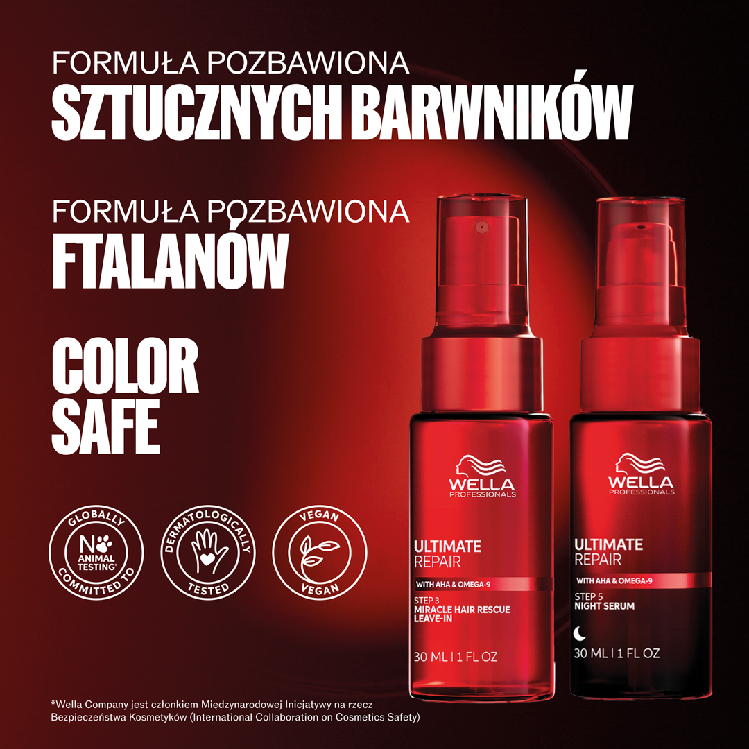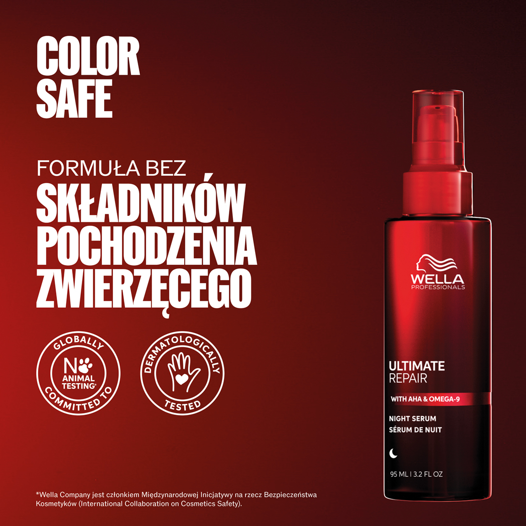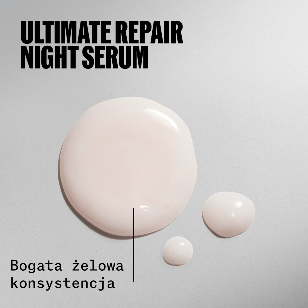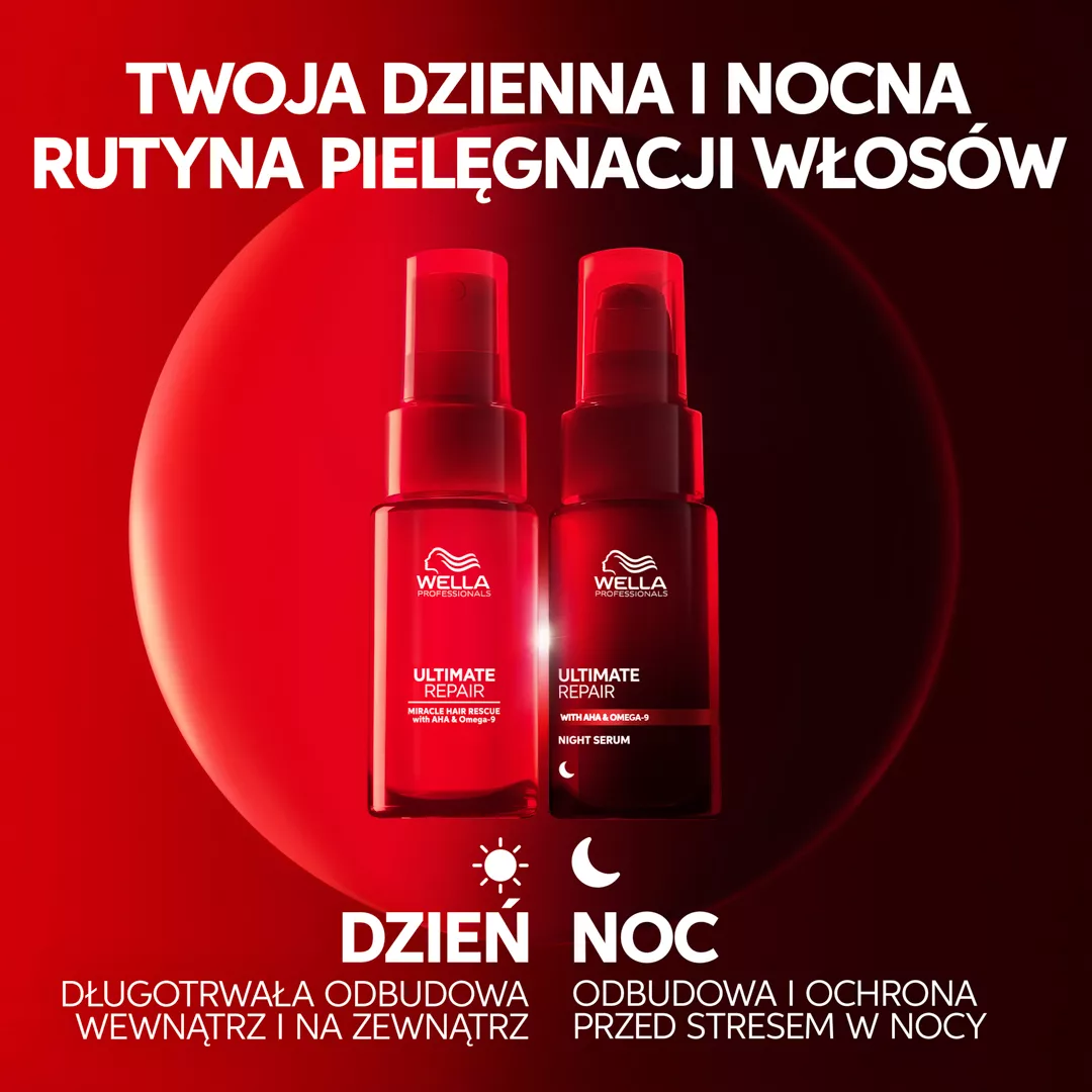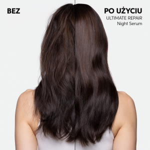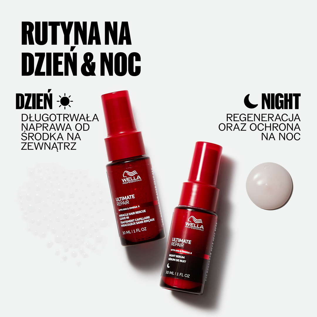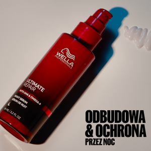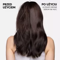 1/3 swojego życia spędzasz na spaniu. Wyobraź sobie, że możesz wykorzystać ten czas, aby naprawić swoje włosy. Serum na noc Wella Professionals Ultimate Repair pozwala Ci to zrobić, dzięki czemu możesz obudzić się z włosami gotowymi na poranek, które wyglądają na odżywione, dzięki potrójnej mocy lekkiej formuły zapewniającej naprawę, nawilżenie i ochronę suchych, zniszczonych włosów. Ta niewymagająca spłukiwania, bezpieczna dla poduszki formuła idealnie działa na Twoje włosy. Serum na noc pomaga zapewnić Twoim włosom najlepszą opiekę, nawet gdy śpisz. Żaden wieczorny rytuał pielęgnacyjny nie powinien być pozbawiony tej formuły. Serum na noc zawiera kwas Omega-9, który wnika głęboko we włosy, nawilżając je, oraz polimery ochronne, które tworzą niewidzialną tarczę. Wszystko to przyczynia się do naprawy zniszczonych włosów w nocy i ich odżywienia przez nawet 8 godzin. Efekty widoczne są już od pierwszej nocy, z kontrolą puszenia się, nawet 6-krotnie gładszymi włosami* oraz wyglądającymi na odżywione, promienne i mniej zmęczone. Po tygodniu możesz doświadczyć do 78% mniej łamliwości* oraz do 86% mniej rozdwojonych końcówek*.