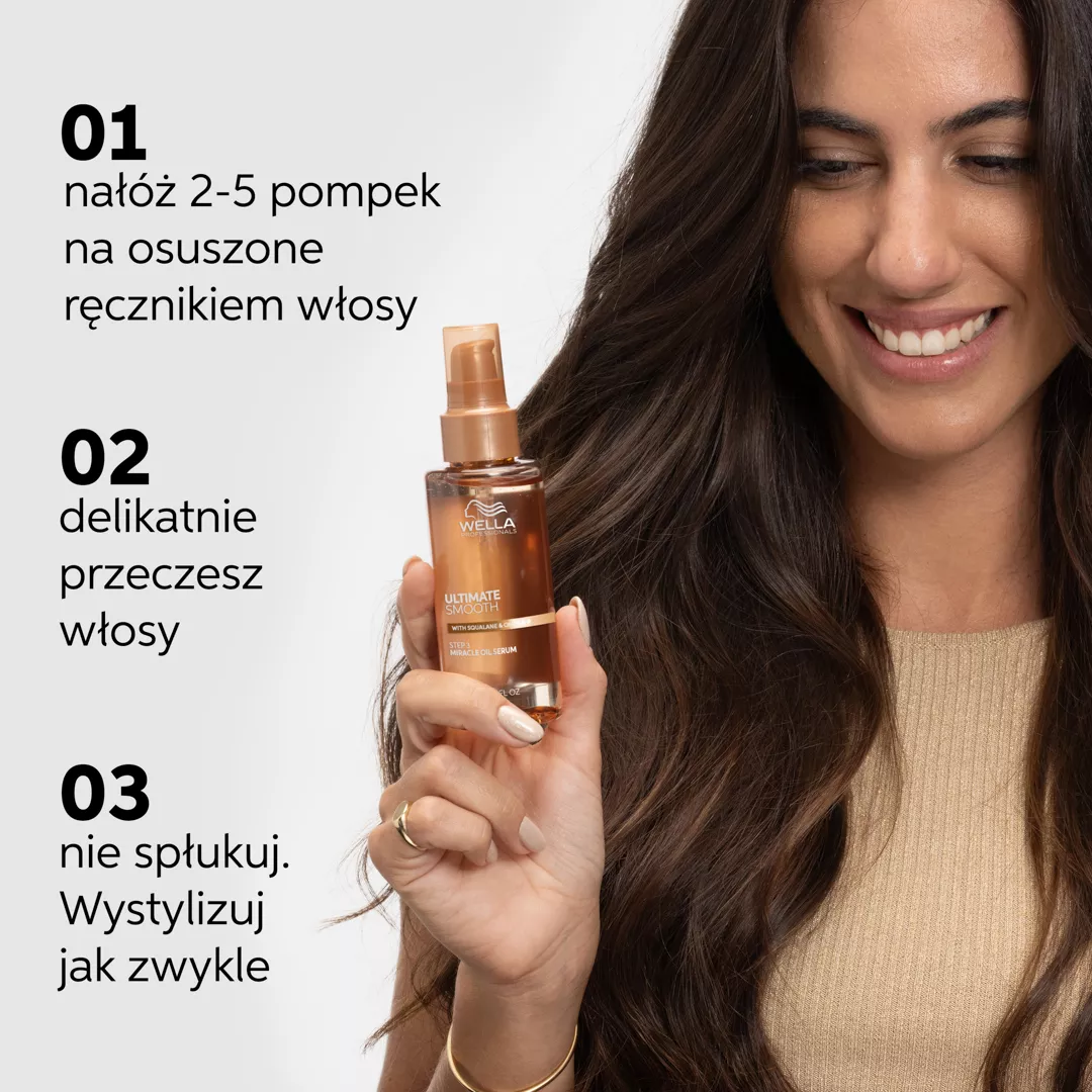 Wella Professionals ULTIMATE SMOOTH to profesjonalny zestaw do pielęgnacji włosów, zaprojektowany dla uzyskania gładkości i odżywienia na suchych, matowych i puszących się włosach. ULTIMATE SMOOTH Miracle Oil Serum to delikatny olejek do włosów (o konsystencji serum), który dogłębnie odżywia włosy od wewnątrz i na zewnątrz, pozostawiając je widocznie gładsze i bardziej lśniące – odżywia włosy w 30 sekund, zapewniając gładkość trwającą do 3 dni. Zawiera Squalane i Omega-9. Serum chroni włosy przed promieniowaniem UV i wysoką temperaturą do 230°C, zapewniając 96-godzinną kontrolę puszenia i jedwabisty blask. Ta pielęgnacja do włosów zawiera kompozycję zapachową z nutami jaśminu, wanilii, bergamotki, brzoskwini i drzewa sandałowego – ciesz się kwiatowym bukietem przy każdym użyciu. Dla najlepszych efektów stosuj razem z szamponem i maską ULTIMATE SMOOTH, aby uzyskać nawet dwukrotnie lepszą kontrolę puszenia*.