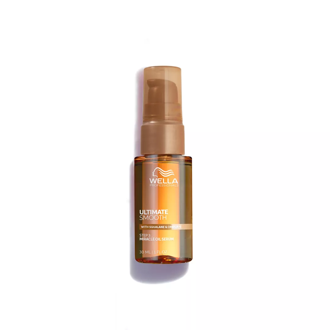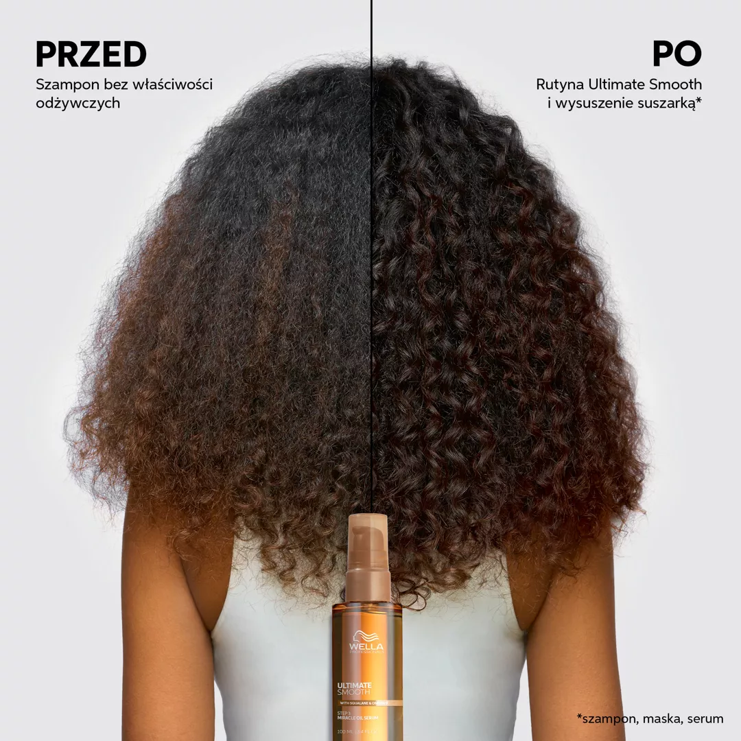 Wella Professionals ULTIMATE SMOOTH to profesjonalny zestaw do pielęgnacji włosów, zaprojektowany dla uzyskania gładkości i odżywienia na suchych, matowych i puszących się włosach. ULTIMATE SMOOTH Miracle Oil Serum to delikatny olejek do włosów (o konsystencji serum), który dogłębnie odżywia włosy od wewnątrz i na zewnątrz, pozostawiając je widocznie gładsze i bardziej lśniące – odżywia włosy w 30 sekund, zapewniając gładkość trwającą do 3 dni. Zawiera Squalane i Omega-9. Serum chroni włosy przed promieniowaniem UV i wysoką temperaturą do 230°C, zapewniając 96-godzinną kontrolę puszenia i jedwabisty blask. Ta pielęgnacja do włosów zawiera kompozycję zapachową z nutami jaśminu, wanilii, bergamotki, brzoskwini i drzewa sandałowego – ciesz się kwiatowym bukietem przy każdym użyciu. Dla najlepszych efektów stosuj razem z szamponem i maską ULTIMATE SMOOTH, aby uzyskać nawet dwukrotnie lepszą kontrolę puszenia*.
