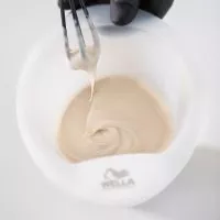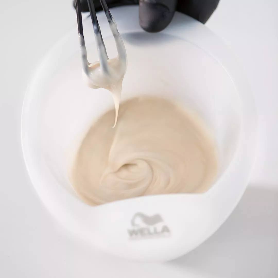W niemetalowej miseczce połącz oksydant z wybraną farbą Illumina Color lub Koleston Perfect od Wella Professionals w proporcji 1:1 (np. 60ml farby + 60 ml oksydantu). Jeśli łączysz aktywator z rozjaśniaczem, użyj proporcji 1:1,5 lub 1:2 (np. 40 g rozjaśniacza + 60 ml oksydantu)