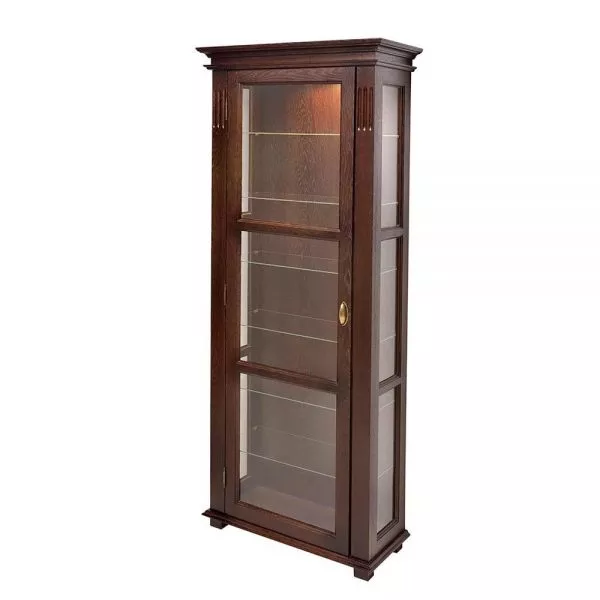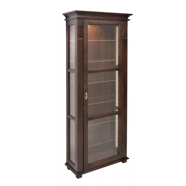 Regał posiada szklane półki zdolne pomieścić niezbędne kosmetyki i preparaty. Idealnie wpasuje się w męskie lub klasyczne wnętrza.
