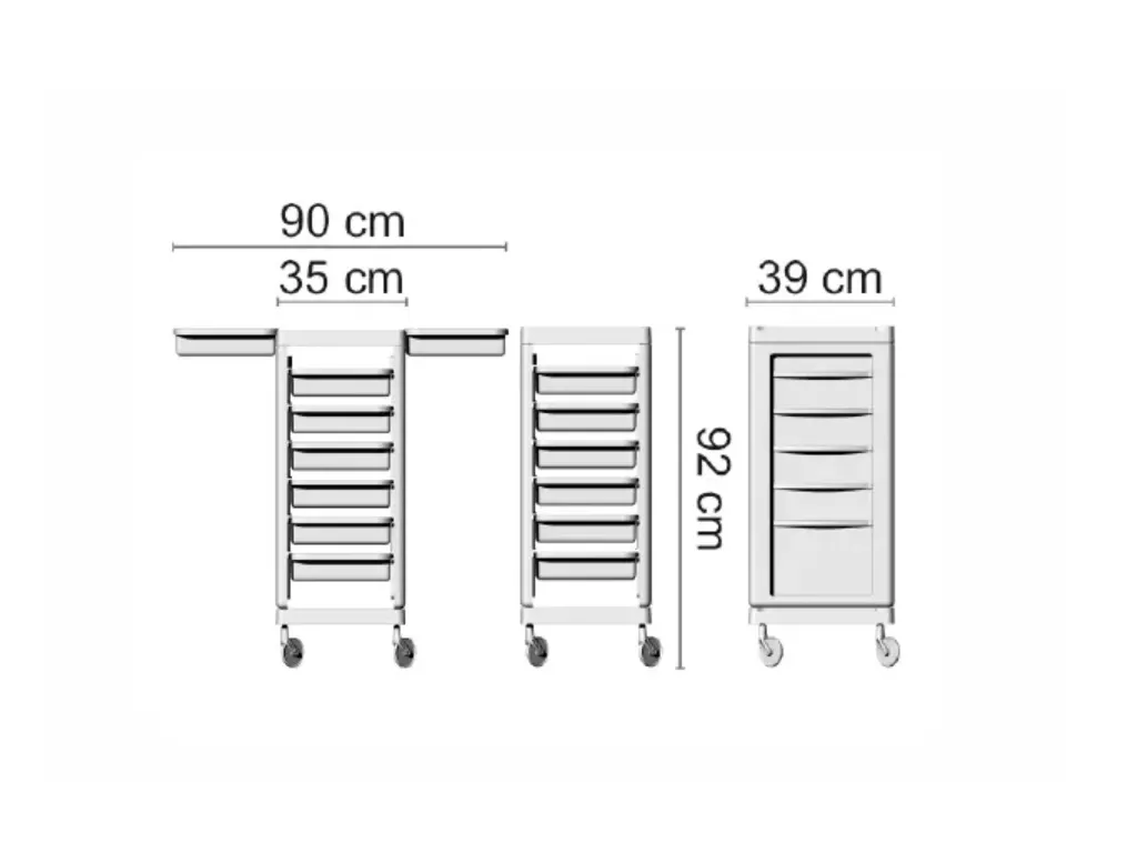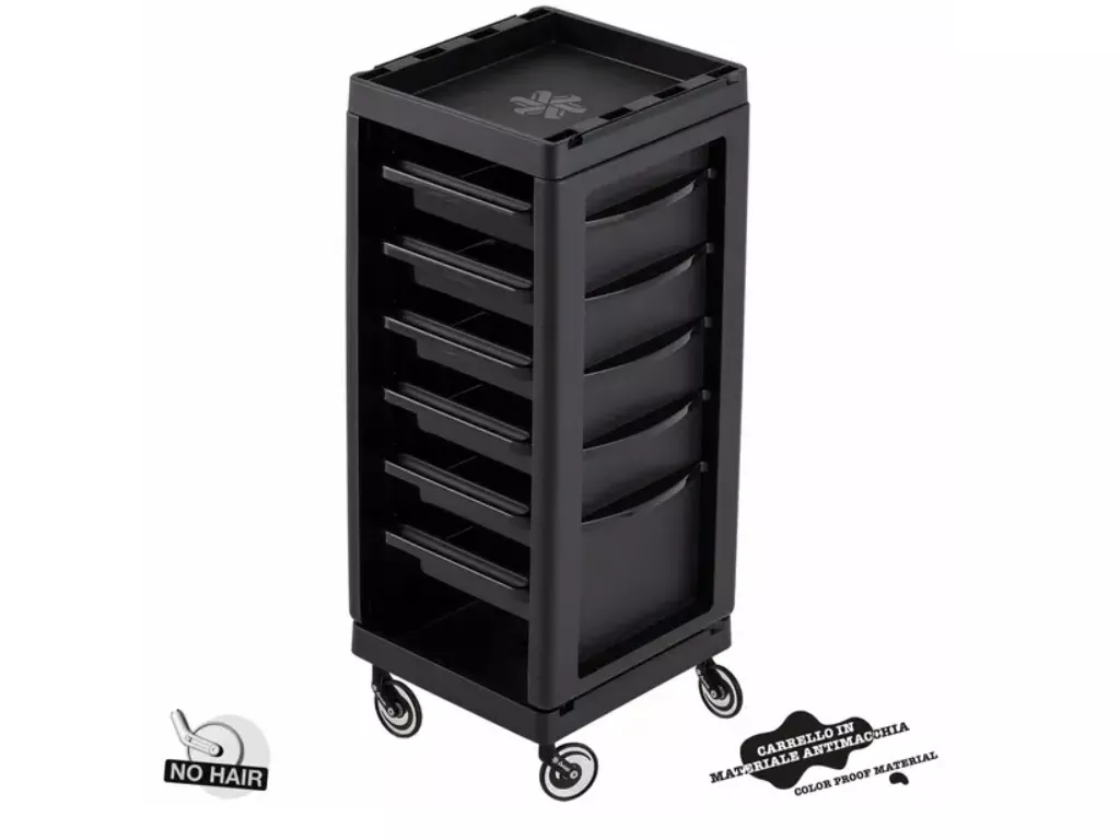 Wózek wykonany jest z wysokiej jakości tworzywa co zapewni długą żywotność produktu. Wyposażony jest w 6 szuflad, którą są otwarte co zapewnia komfortowe użytkowanie. Szuflady mogą być umieszczone po bokach wózka co pozwala stworzyć szeroki blat. Wózek jest wyposażony w nowoczesne kółka NO-HAIR Wheels, które są odporne na zabrudzenia i posiadają system zapobiegający wkręcaniu się włosów w łożyska kółek.
