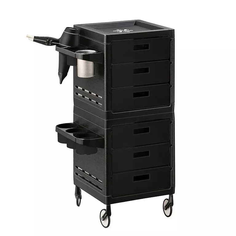Wózek fryzjerski Ceriotti My to świetny, funkcjonalny wózek, który posiada aż 6 szuflad, 2 uchwyty na suszarkę oraz 4 kubki umieszczone po bokach. Całość wykonana jest z wysokiej jakości tworzywa, które odporne jest na zniszczenia oraz zabrudzenia. Dzięki tej prostej funkcjonalności wózek jest łatwiejszy w czyszczeniu i bardziej odporny na zabrudzenia. Co więcej, specjalne kółka No-Hair Weels są odporne na zabrudzenia oraz zostały zaprojektowane tak, że włosy nie wkręcają się w łożysko. Kółka dzięki zmniejszonemu kontaktowi z podłogą zbierają mniej włosów. Dzięki temu jest czysto i skutecznie. Mocowanie kółek jest tak zaprojektowane, aby zapobiegać owijaniu się włosów wokół kółka. Co więcej, kółka można łatwo odkręcić i je oczyścić. W ten sposób komfort pracy w salonie wzrasta.
