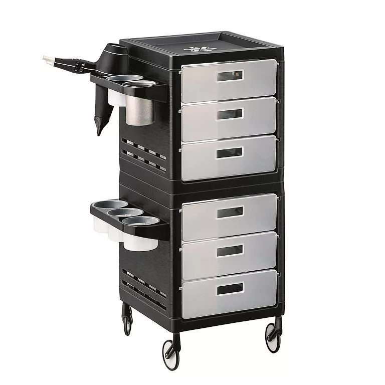 Wózek fryzjerski Ceriotti My to świetny, funkcjonalny wózek, który posiada aż 6 szuflad, 2 uchwyty na suszarkę oraz 4 kubki umieszczone po bokach. Całość wykonana jest z wysokiej jakości tworzywa, które odporne jest na zniszczenia oraz zabrudzenia. Dzięki tej prostej funkcjonalności wózek jest łatwiejszy w czyszczeniu i bardziej odporny na zabrudzenia. Co więcej, specjalne kółka No-Hair Weels są odporne na zabrudzenia oraz zostały zaprojektowane tak, że włosy nie wkręcają się w łożysko. Kółka dzięki zmniejszonemu kontaktowi z podłogą zbierają mniej włosów. Dzięki temu jest czysto i skutecznie. Mocowanie kółek jest tak zaprojektowane, aby zapobiegać owijaniu się włosów wokół kółka. Co więcej, kółka można łatwo odkręcić i je oczyścić. W ten sposób komfort pracy w salonie wzrasta.