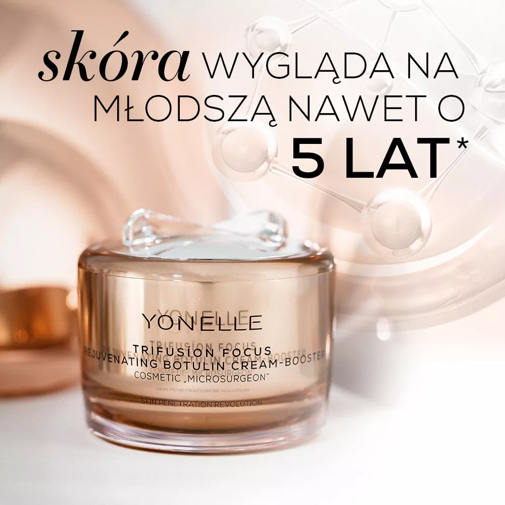 Odkryj luksusową pielęgnację z Yonelle Trifusion Focus, odmładzającym botulinowym kremem-boosterem stworzonym specjalnie dla cery dojrzałej i bardzo dojrzałej. Innowacyjna formuła bazuje na nowoczesnych osiągnięciach regeneracyjnej medycyny estetycznej, wykorzystując egzosomy, booster NAD+ oraz peptydy botulinowe, aby odmłodzić skórę w 11 kluczowych aspektach. Doświadcz efektu liftingu i spektakularnego wygładzenia, zachowując jednocześnie aksamitną delikatność i pełen komfort skóry.