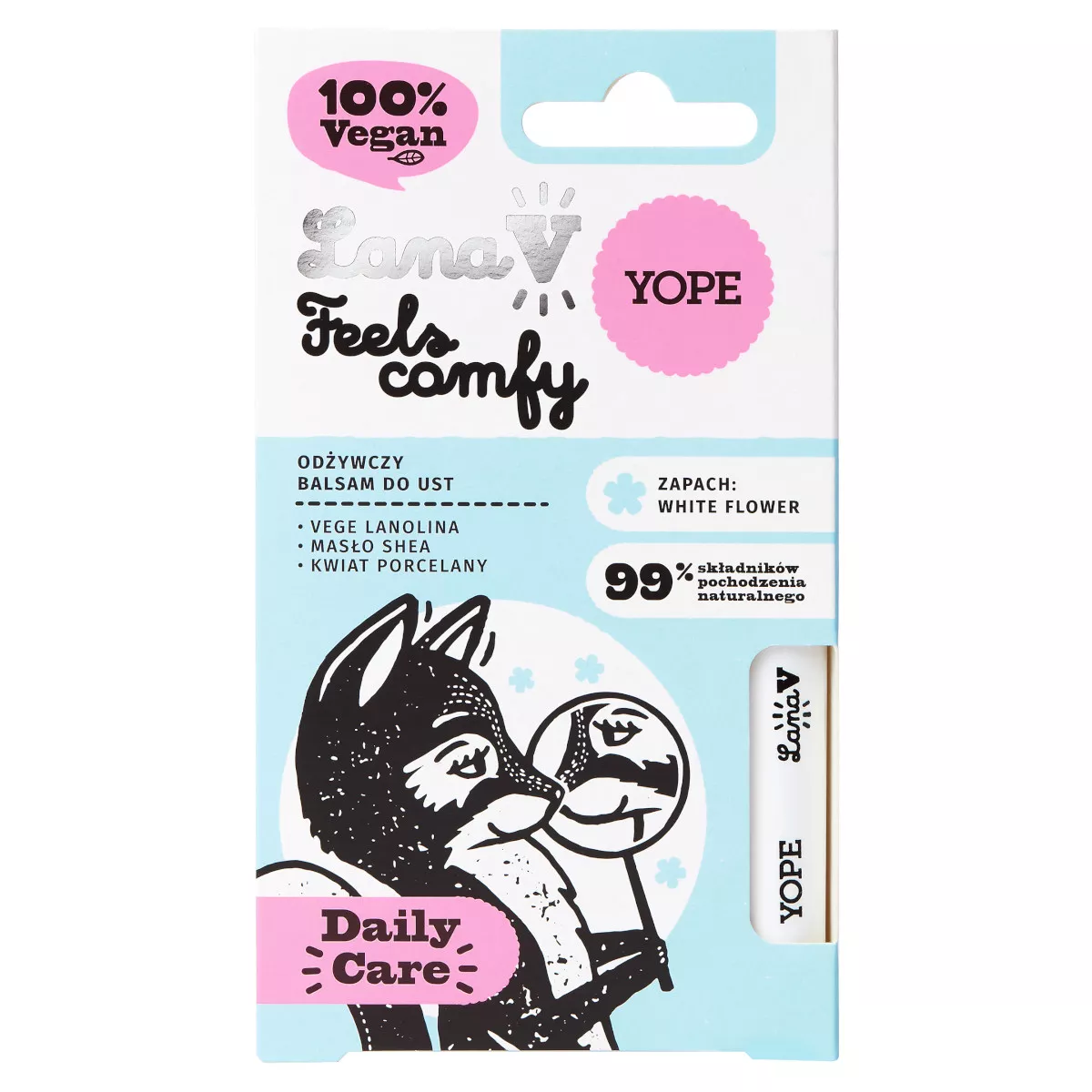 Poznaj Yope Lana V Feels comfy – ochronny, wegański balsam do ust, który każdego dnia dba o Twoje usta, zapewniając im intensywne nawilżenie, gładkość i wyjątkową miękkość. To codzienna dawka komfortu i ochrony, zamknięta w poręcznym sztyfcie o pojemności 2,5g. Otul swoje usta delikatnym zapachem białych kwiatów i ciesz się promiennym, zdrowym wyglądem przez cały dzień!