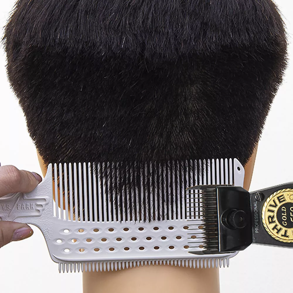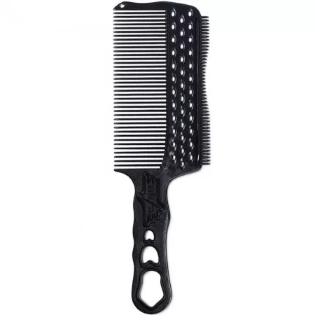 Ten czarny grzebień wyróżnia się długimi zębami, które oszczędzają czas i ułatwiają pracę. Pierwszy ząb wyposażony jest w specjalne wcięcia, co pomaga w dopasowaniu grzebienia do krzywizny głowy, umożliwiając dokładne ustawienie kąta 90 stopni. Dzięki teksturze i gwiaździstym otworom na rączce, grzebień nie ślizga się w dłoni, zapewniając pewny chwyt podczas strzyżenia.
